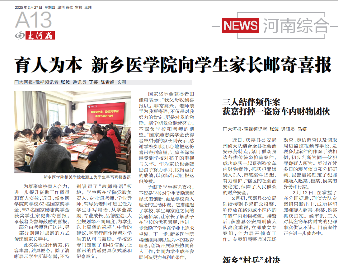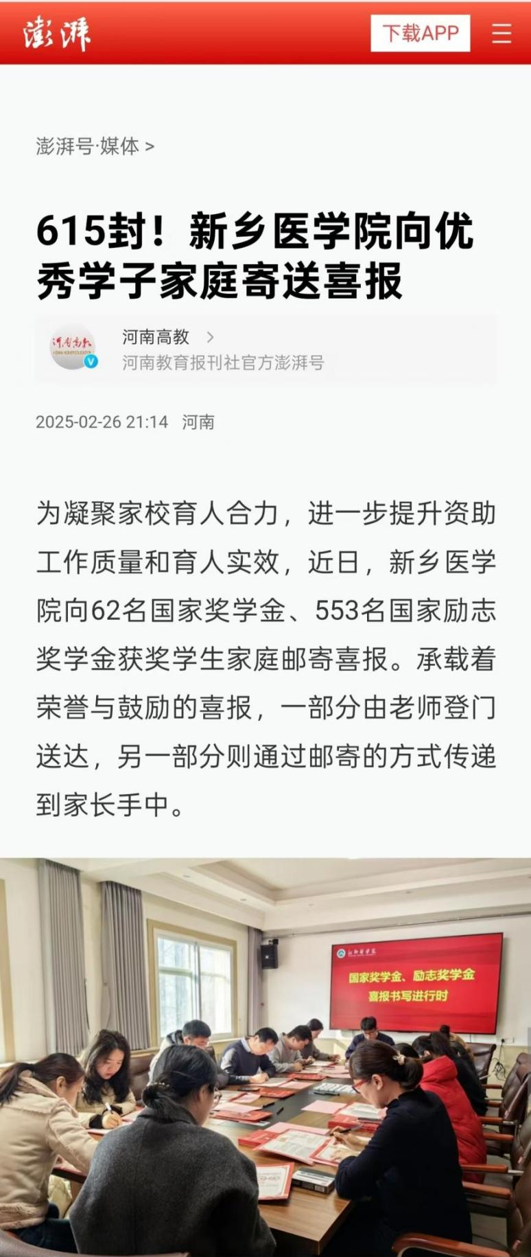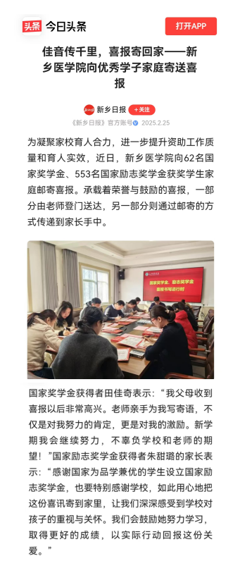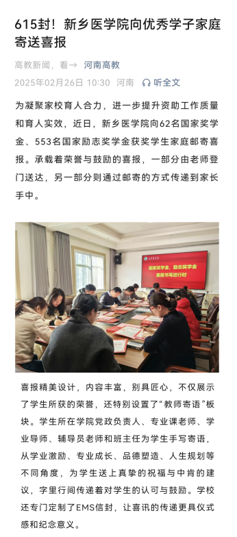 为凝聚家校育人合力,进一步提升资助工作质量和育人实效,我校向62名国家奖学金、553名国家励志奖学金获奖学生家长邮寄喜报。相关学院党政负责人、专业课老师、学业导师、辅导员老师和班主任手写寄语,送上祝福与建议,字里行间传递着对学生的认可与鼓励。寄送喜报不仅是对学生奖励表彰形式的创新,更是学校育人理念的生动体现,搭建起学校、学生与家庭之间的沟通桥梁,激励学生在学业上追求卓越。大河报、河南高教、澎湃新闻等多家媒体报道。