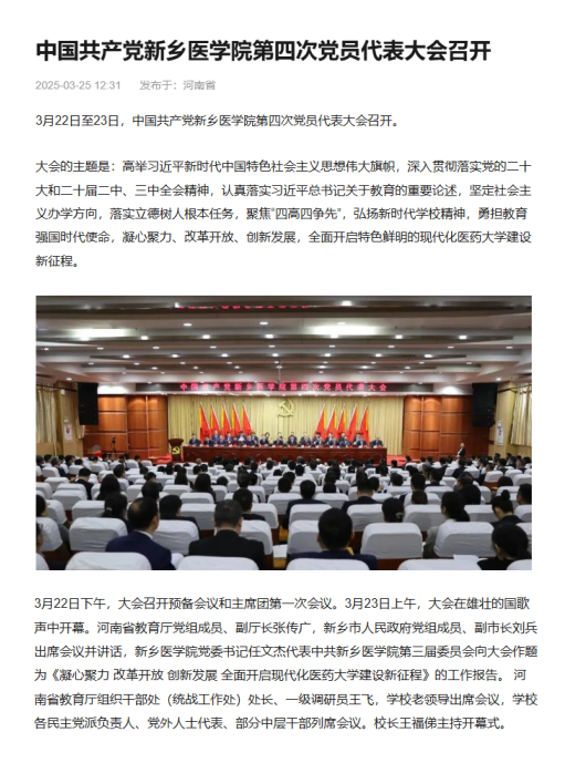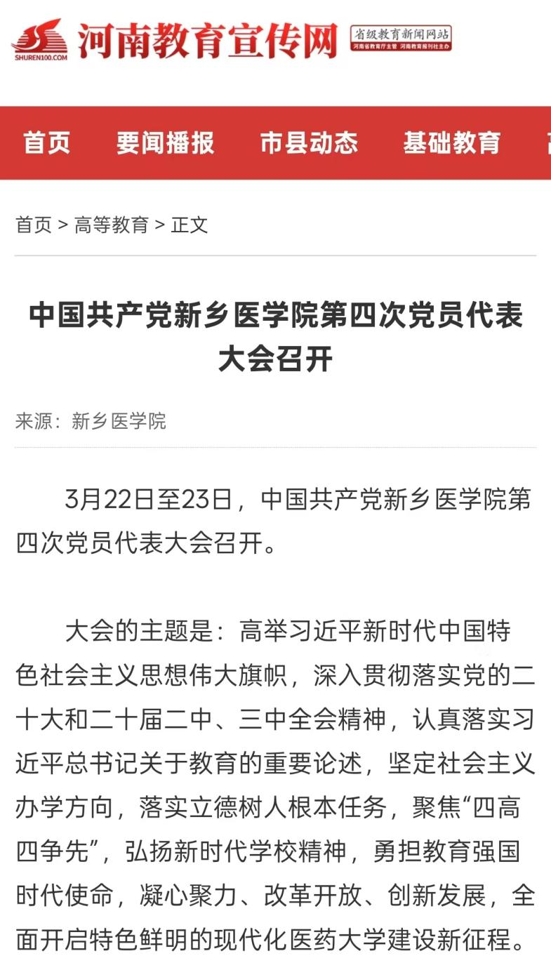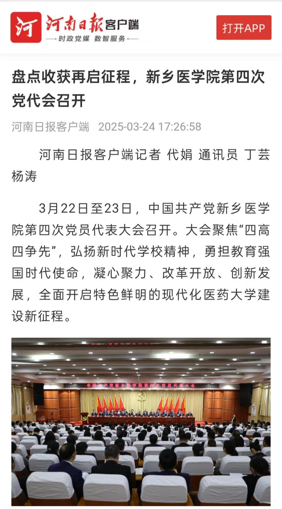3月22日至23日,中国共产党华亿在线手机版(大中国区)第四次党员代表大会召开。大会的主题是:高举习近平新时代中国特色社会主义思想伟大旗帜,深入贯彻落实党的二十大和二十届二中、三中全会精神,认真落实习近平总书记关于教育的重要论述,坚定社会主义办学方向,落实立德树人根本任务,聚焦“四高四争先”,弘扬新时代学校精神,勇担教育强国时代使命,凝心聚力、改革开放、创新发展,全面开启特色鲜明的现代化医药大学建设新征程。河南日报客户端、大河报·豫视频、大象新闻、今日头条、河南高教、搜狐网等多家媒体报道。