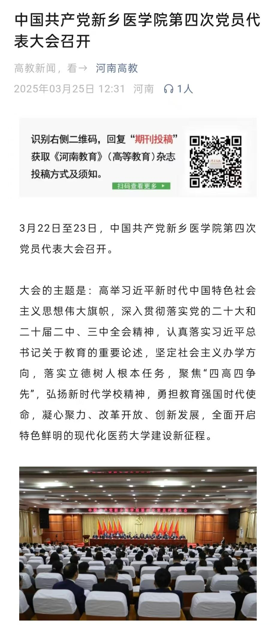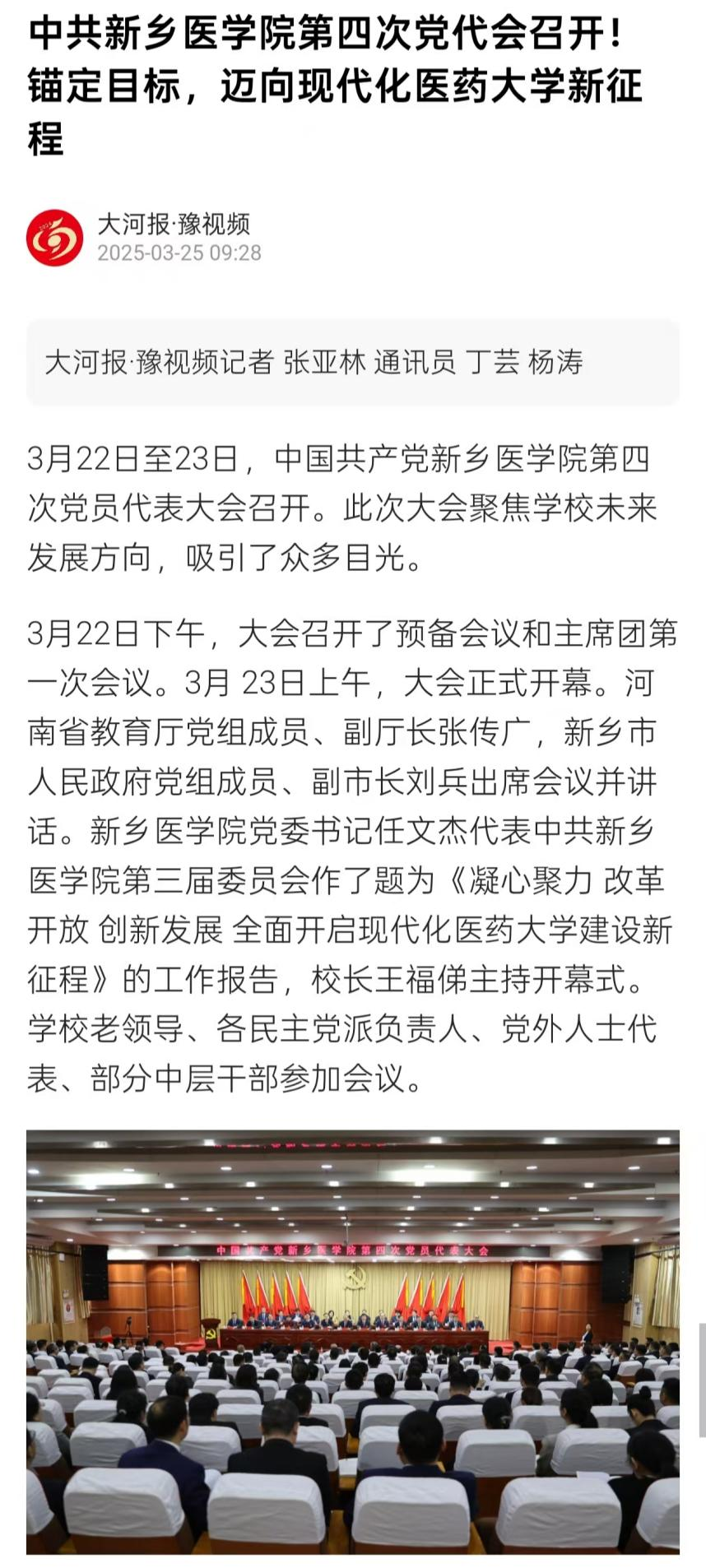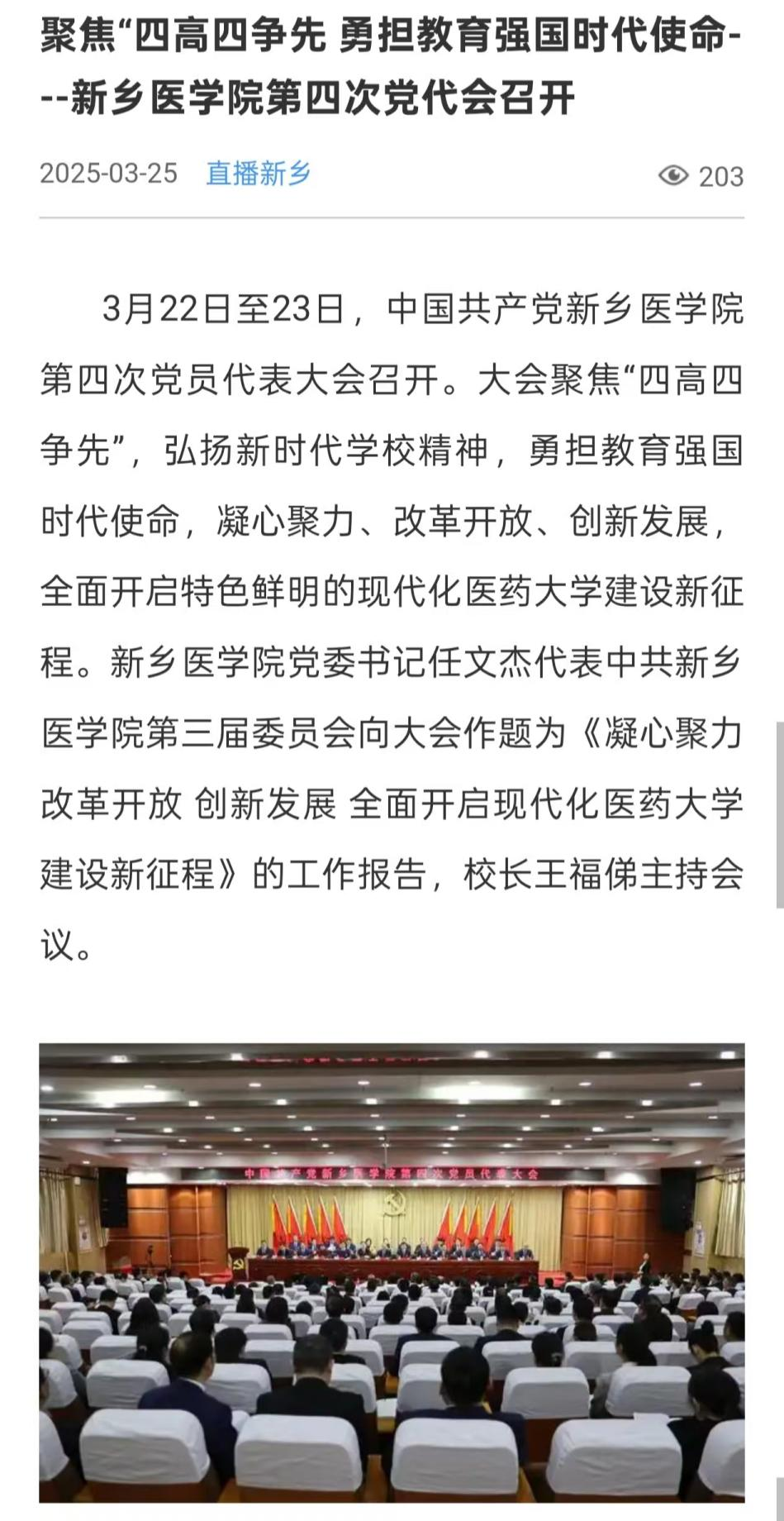 3月22日至23日,中国共产党华亿在线手机版(大中国区)第四次党员代表大会召开。大会的主题是:高举习近平新时代中国特色社会主义思想伟大旗帜,深入贯彻落实党的二十大和二十届二中、三中全会精神,认真落实习近平总书记关于教育的重要论述,坚定社会主义办学方向,落实立德树人根本任务,聚焦“四高四争先”,弘扬新时代学校精神,勇担教育强国时代使命,凝心聚力、改革开放、创新发展,全面开启特色鲜明的现代化医药大学建设新征程。河南日报客户端、大河报·豫视频、大象新闻、今日头条、河南高教、搜狐网等多家媒体报道。