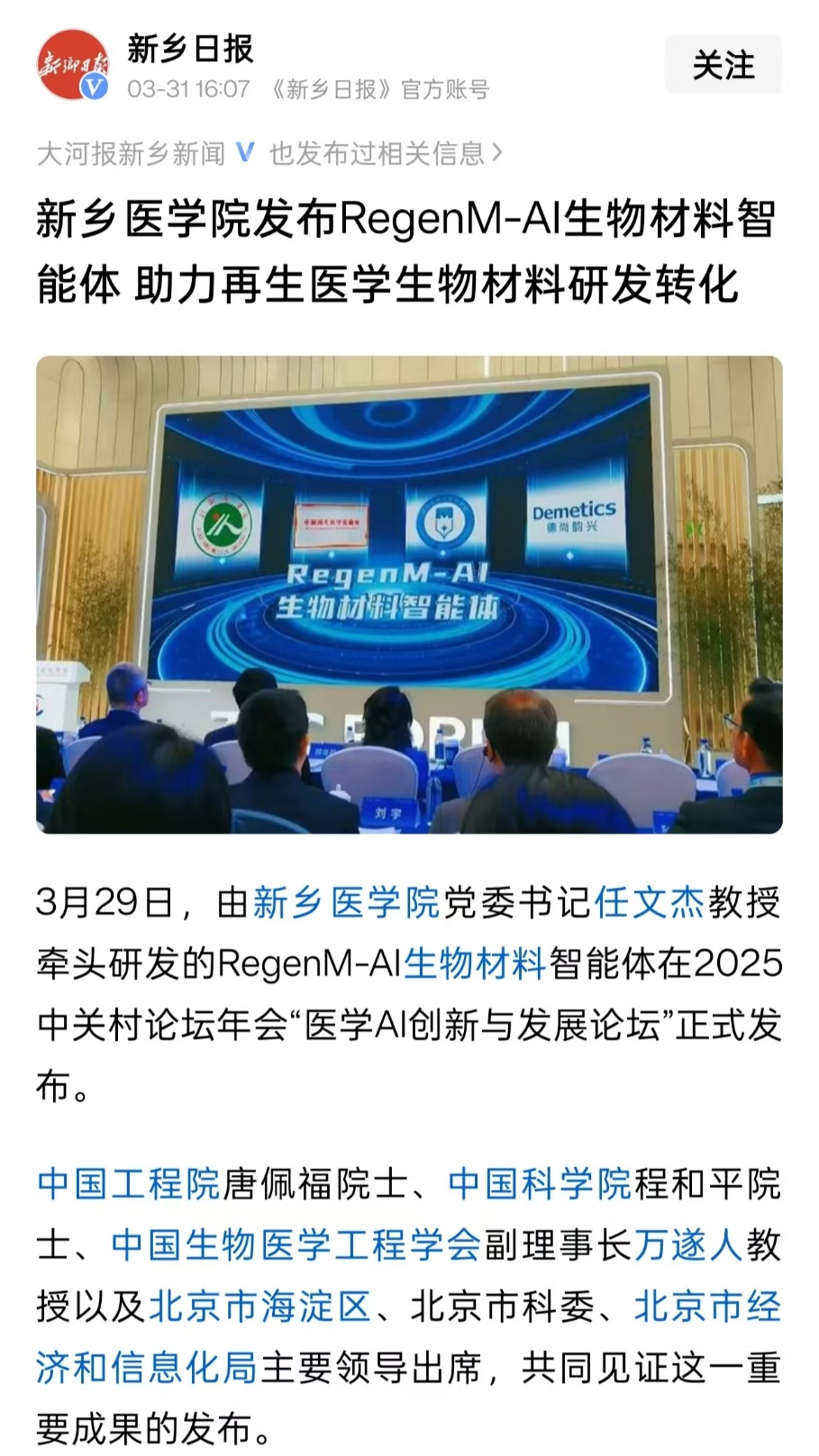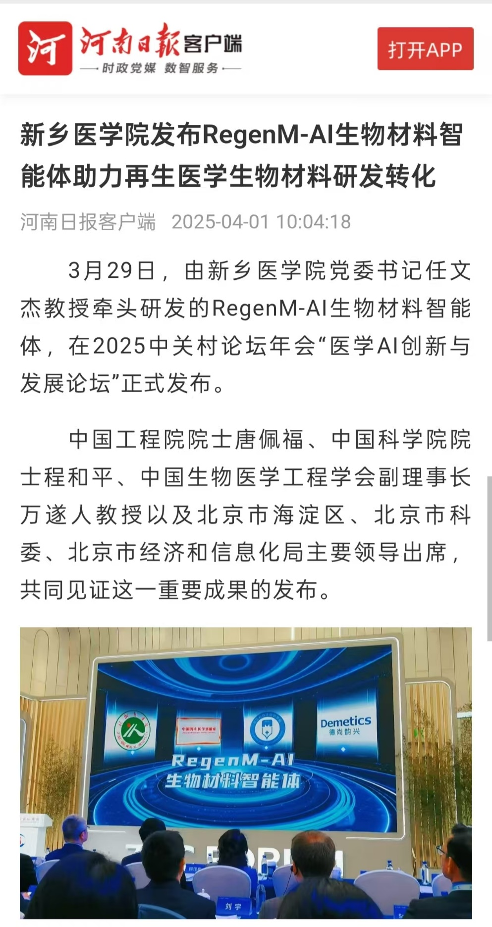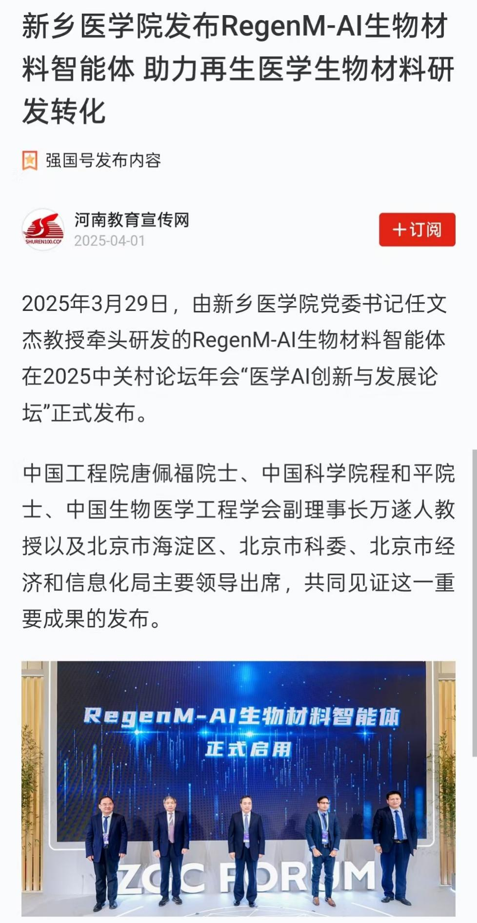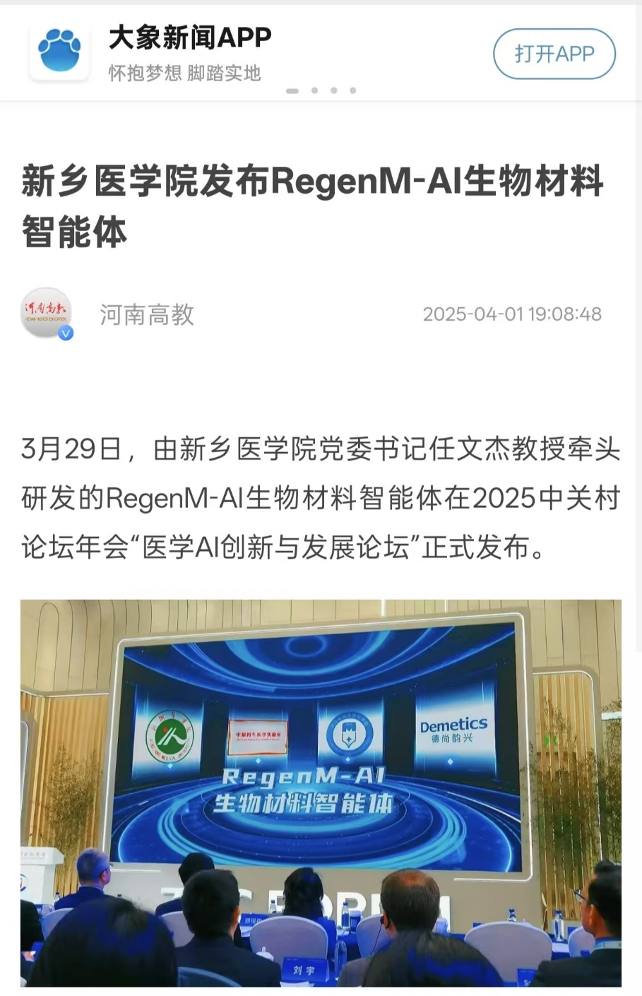 3月29日,由我校党委书记任文杰教授牵头研发的RegenM-AI生物材料智能体在2025中关村论坛年会“医学AI创新与发展论坛”正式发布。RegenM-AI生物材料智能体在该国家级论坛发布,不仅展示了我校在人工智能、生物材料以及大数据整合方面的技术积累,更充分体现了我校在推进理工医融合、深化产学研协同创新方面做出的深度探索与积极实践。以此次中关村论坛为窗口,我校将持续深化数理医学特色,推动更多创新成果走向世界,为全球医疗健康事业贡献中国智慧。河南日报客户端、学习强国、顶端新闻、大河报·豫视频、大象新闻等多家媒体报道。