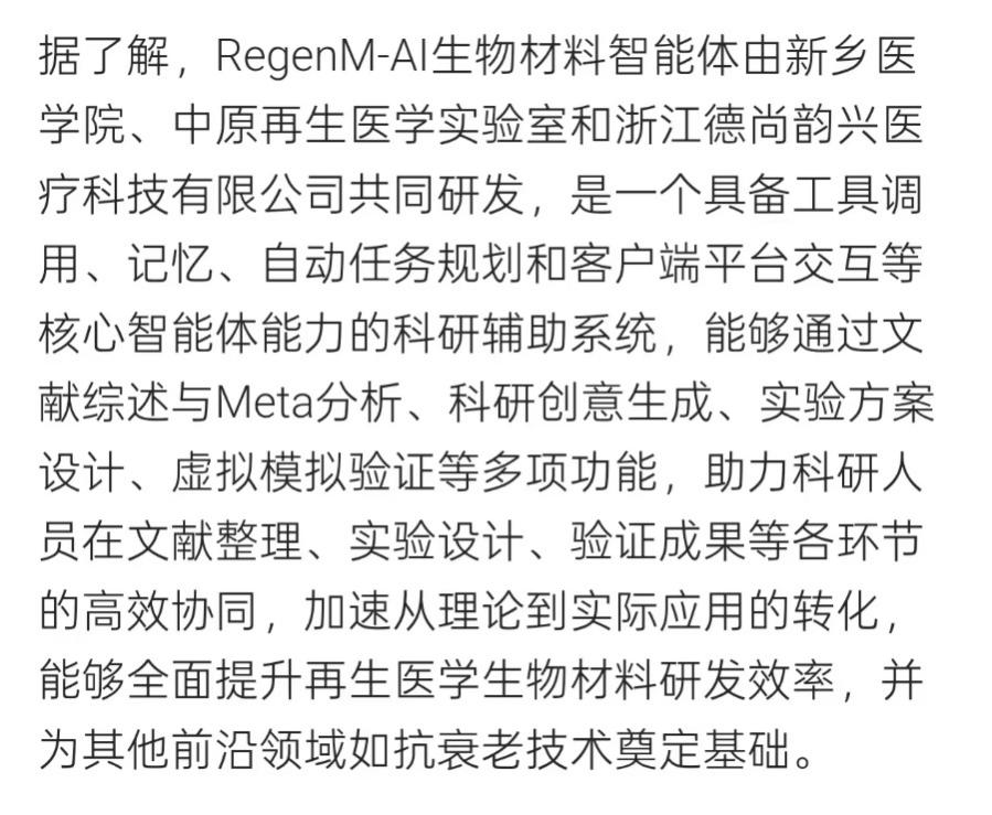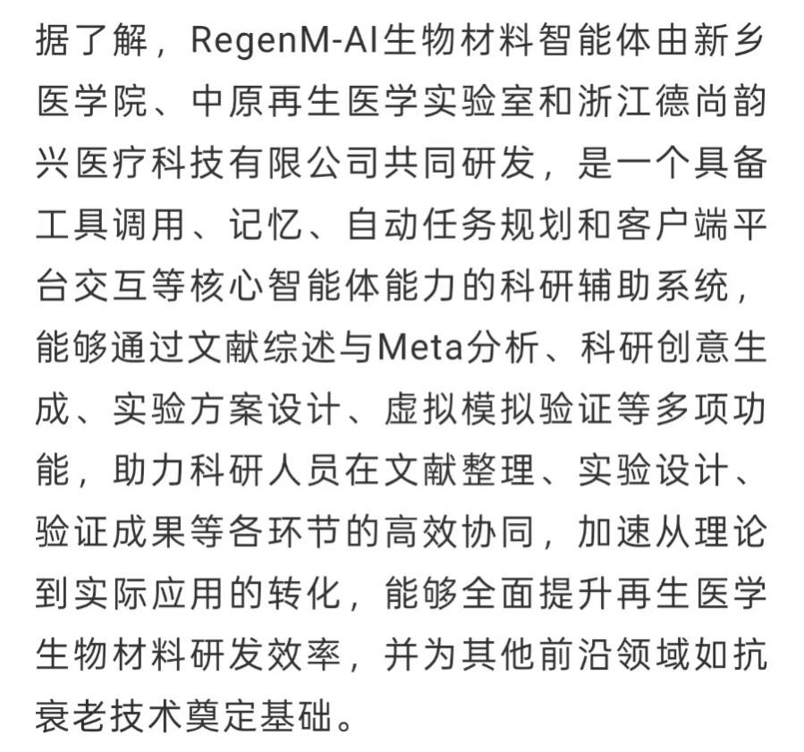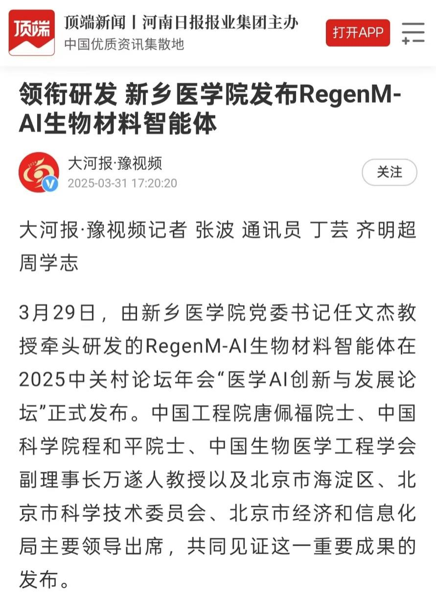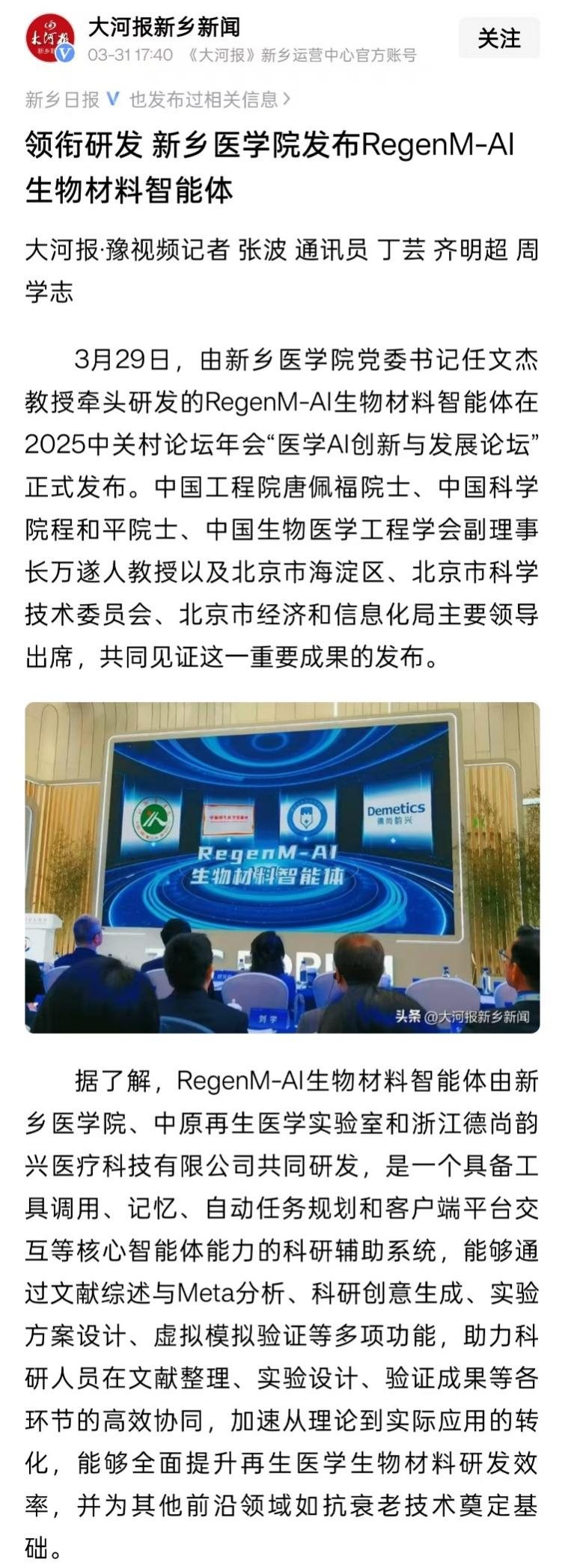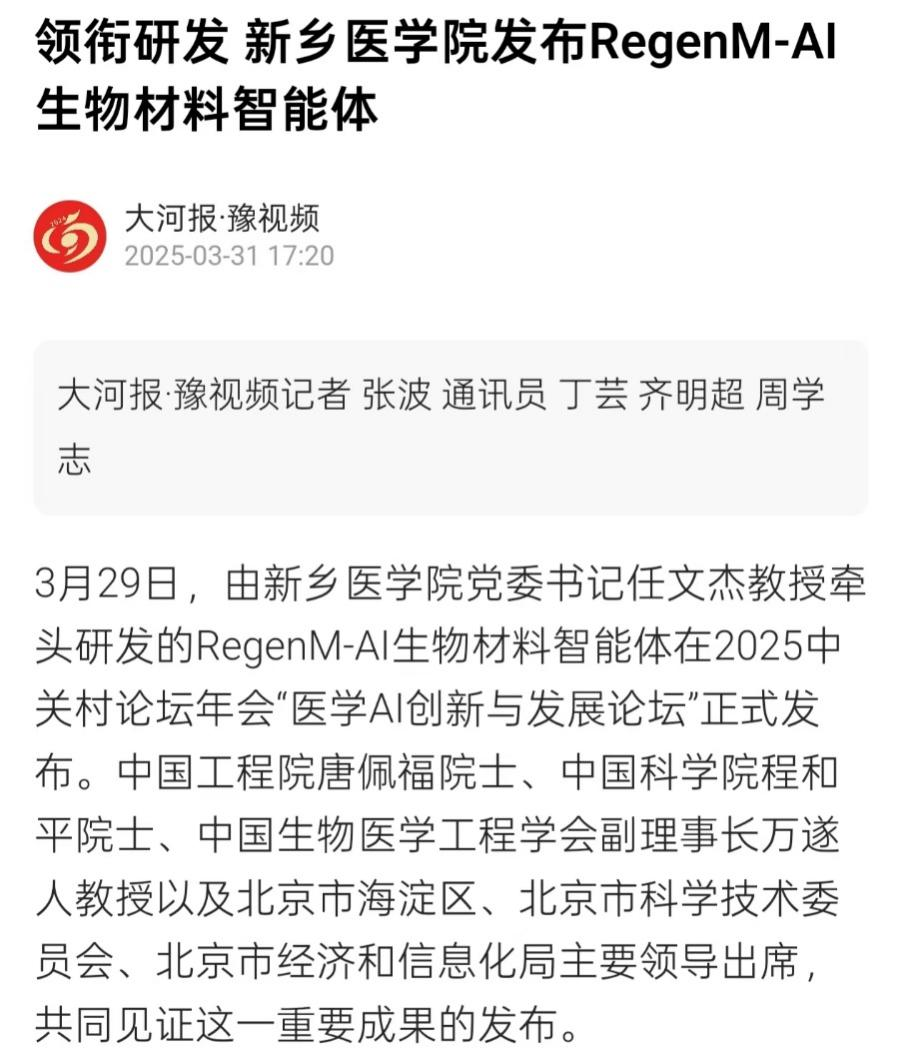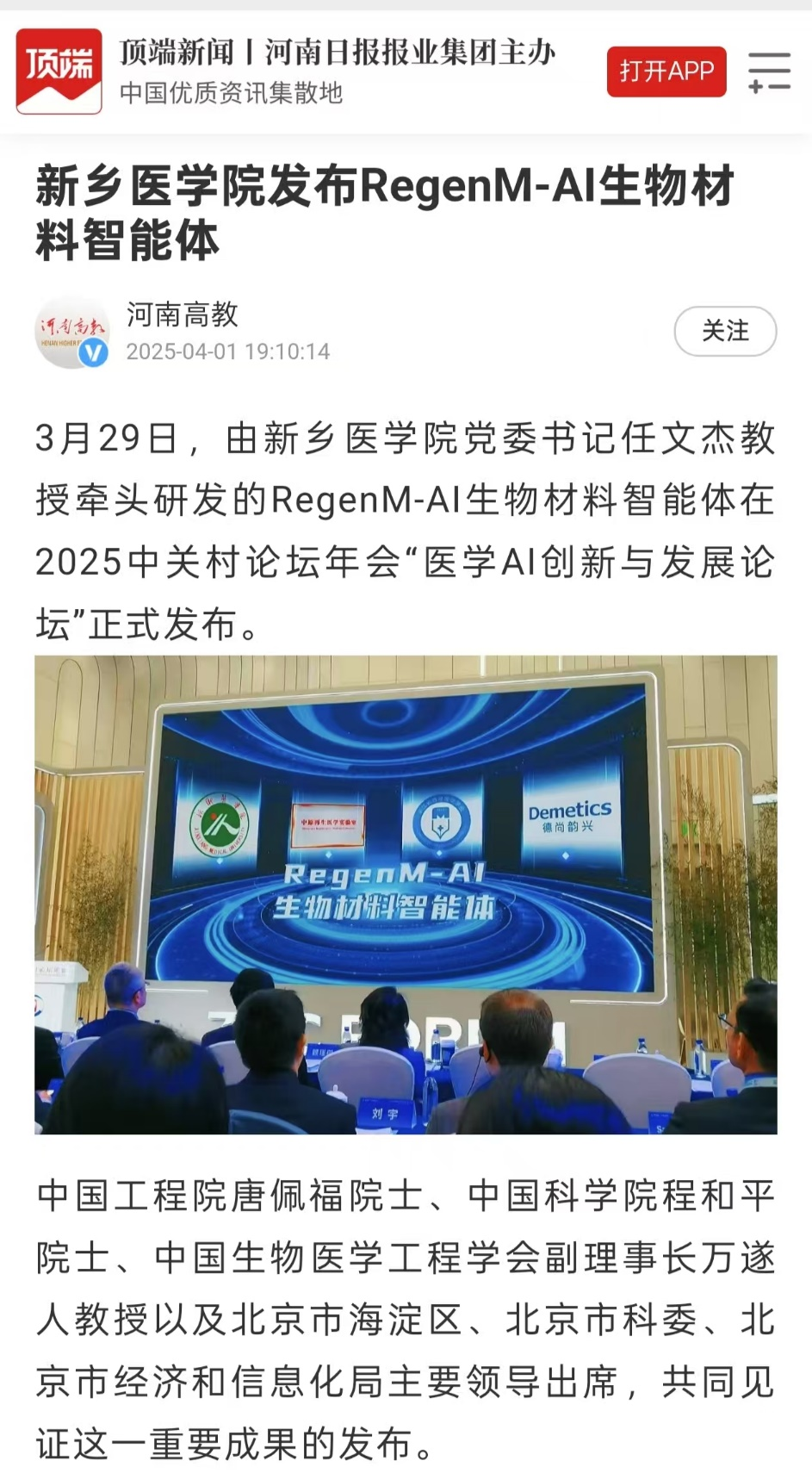 3月29日,由我校党委书记任文杰教授牵头研发的RegenM-AI生物材料智能体在2025中关村论坛年会“医学AI创新与发展论坛”正式发布。RegenM-AI生物材料智能体在该国家级论坛发布,不仅展示了我校在人工智能、生物材料以及大数据整合方面的技术积累,更充分体现了我校在推进理工医融合、深化产学研协同创新方面做出的深度探索与积极实践。以此次中关村论坛为窗口,我校将持续深化数理医学特色,推动更多创新成果走向世界,为全球医疗健康事业贡献中国智慧。河南日报客户端、学习强国、顶端新闻、大河报·豫视频、大象新闻等多家媒体报道。