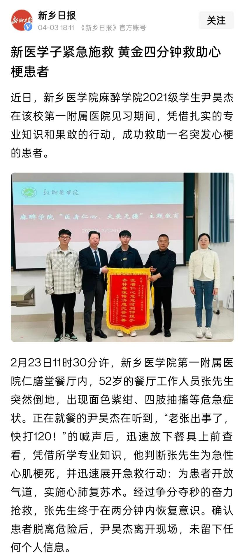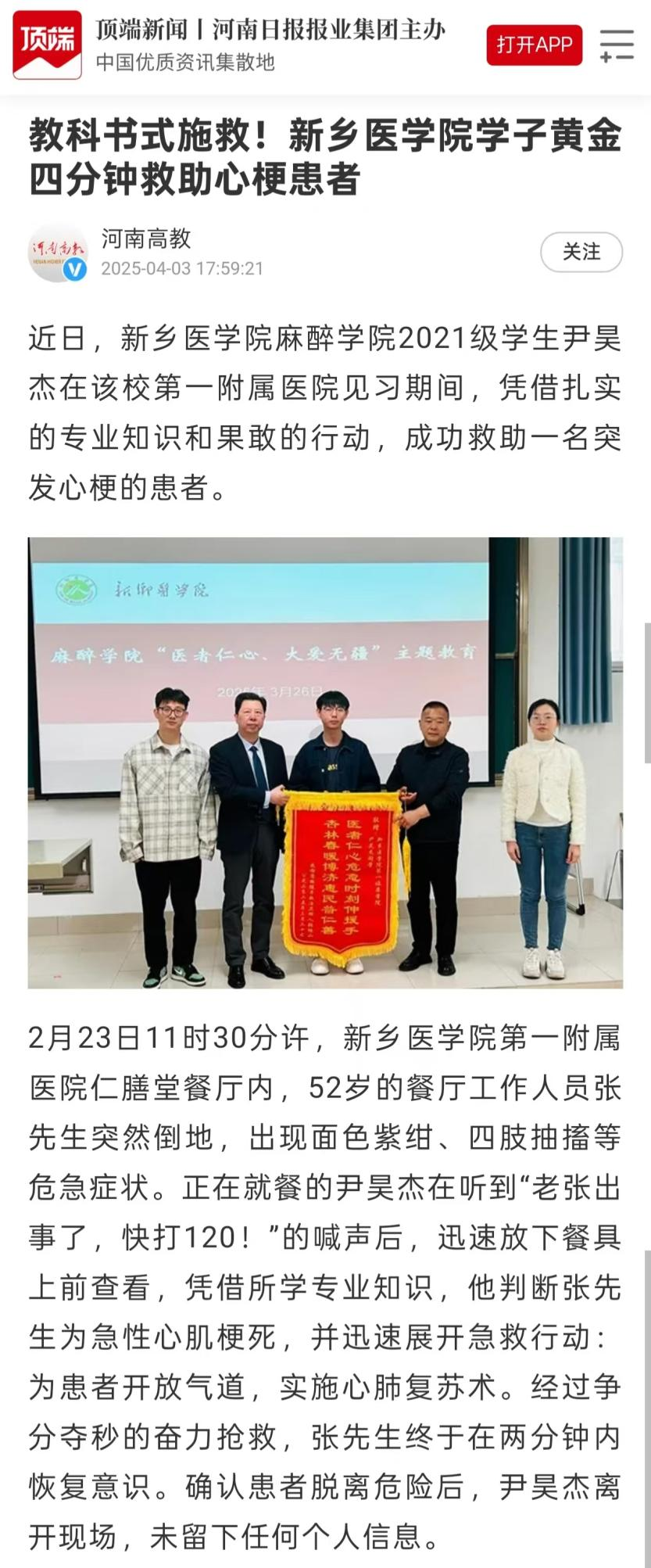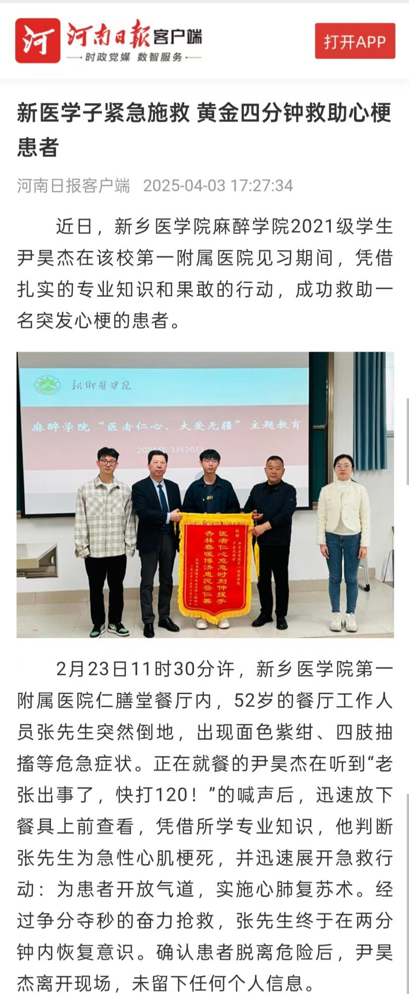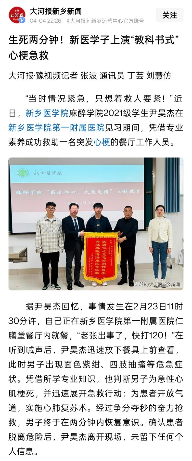 近日,麻醉学院2021级学生尹昊杰在我校第一附属医院见习期间,凭借扎实的专业知识和果敢的行动,成功救助一名突发心梗的患者。医学教育不仅是知识的传递,更是责任与使命的接力。尹昊杰的施救行为充分展现了新医学子扎实的专业素养和深厚的人文关怀,生动诠释了新时代大学生勇于担当、无私奉献的精神风貌。学习强国、河南日报客户端、顶端新闻、大河报·豫视频等多家媒体报道。
