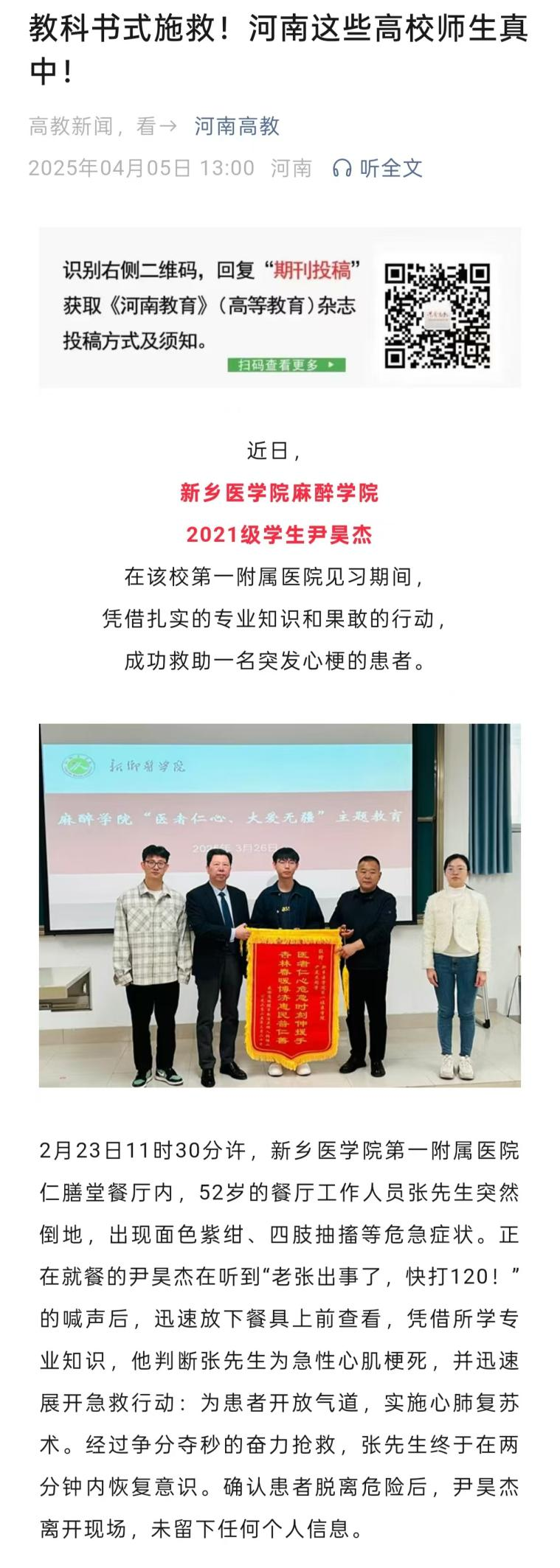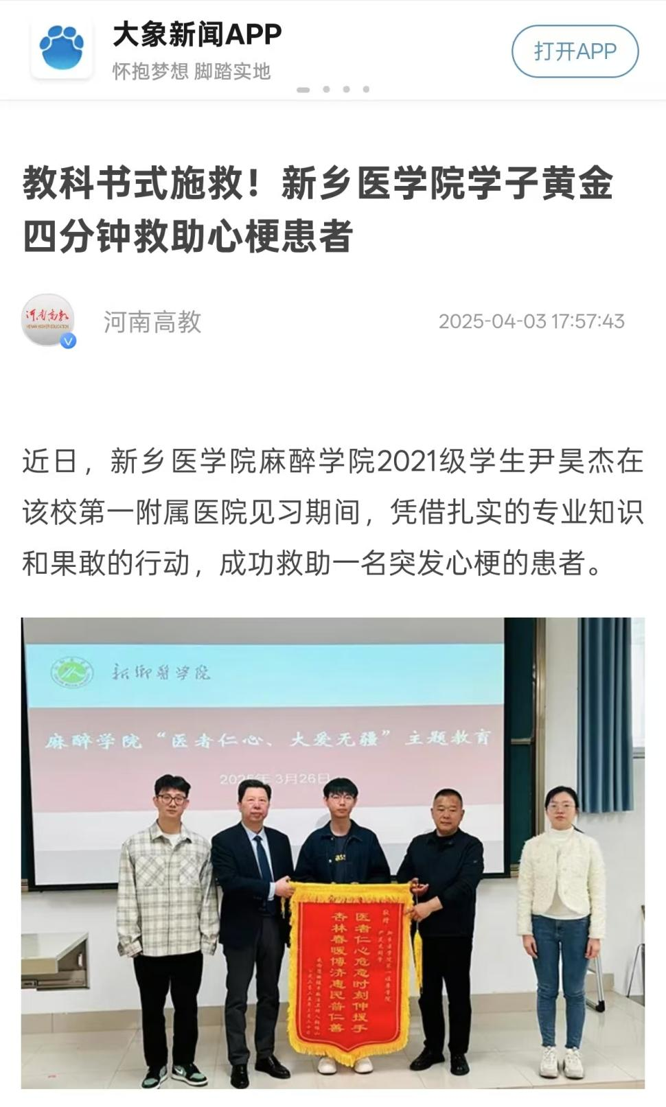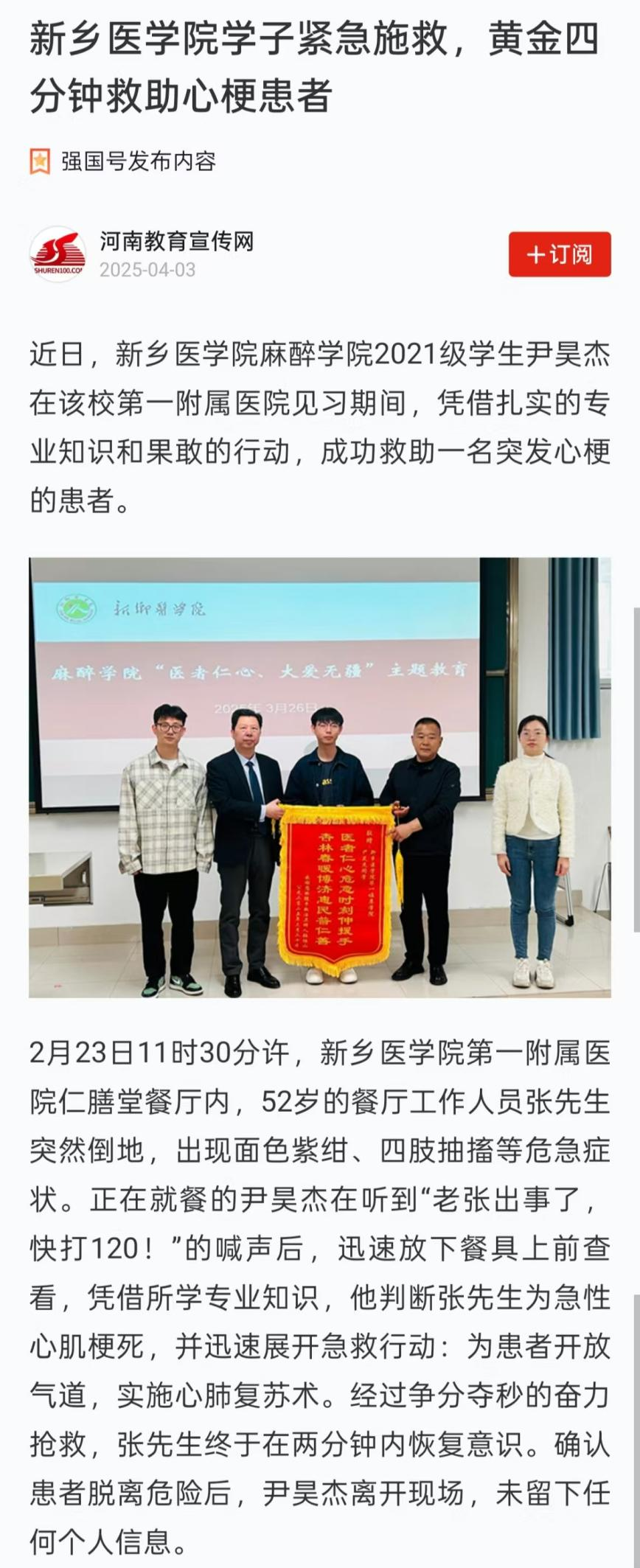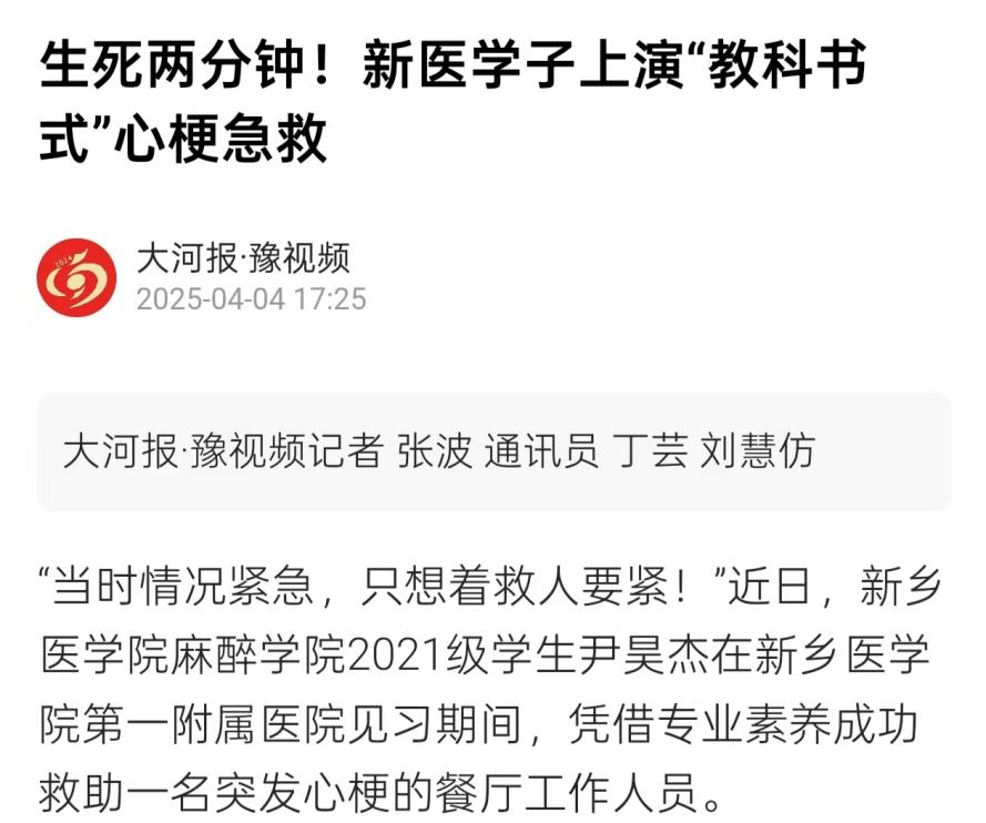 近日,麻醉学院2021级学生尹昊杰在我校第一附属医院见习期间,凭借扎实的专业知识和果敢的行动,成功救助一名突发心梗的患者。医学教育不仅是知识的传递,更是责任与使命的接力。尹昊杰的施救行为充分展现了新医学子扎实的专业素养和深厚的人文关怀,生动诠释了新时代大学生勇于担当、无私奉献的精神风貌。学习强国、河南日报客户端、顶端新闻、大河报·豫视频等多家媒体报道。