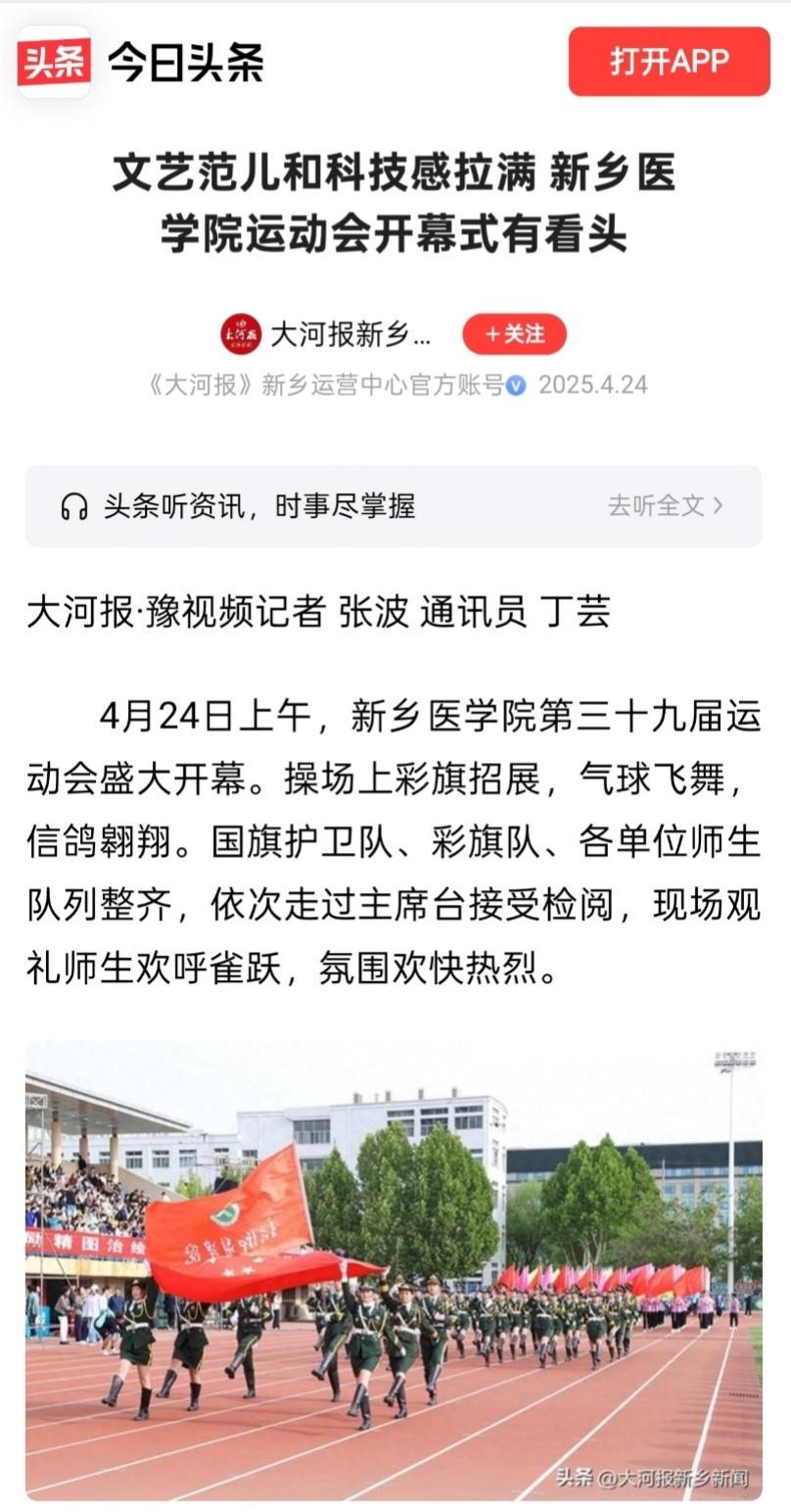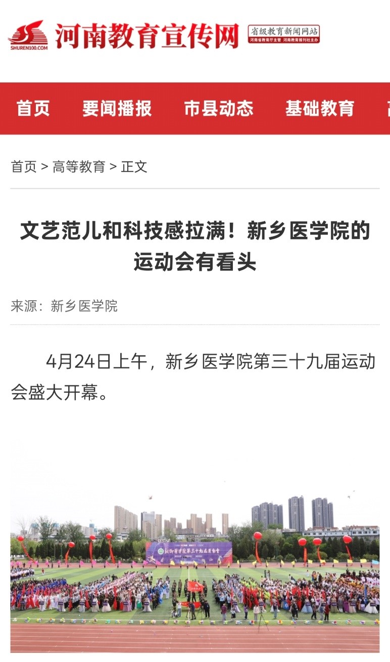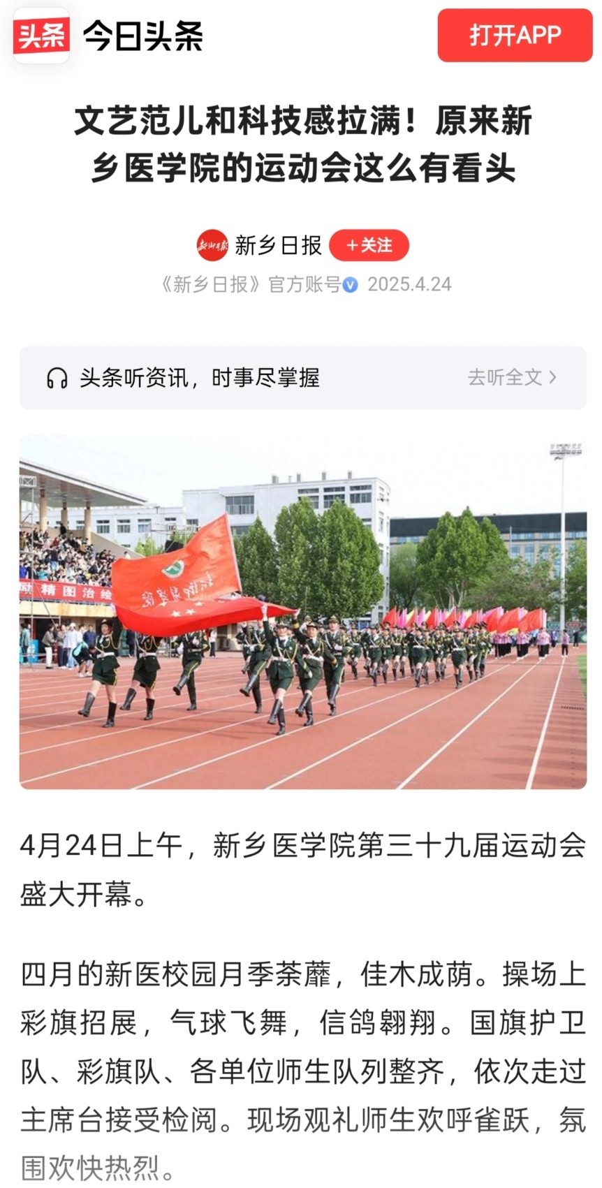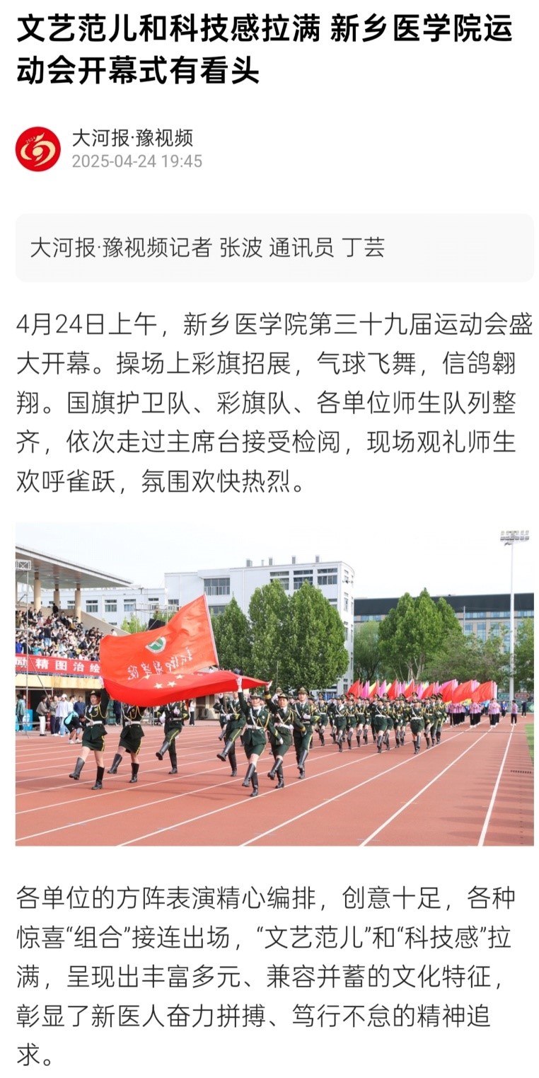 4月24日上午,我校第三十九届运动会开幕。开幕式上,各单位的方阵表演精心编排,创意十足,各种惊喜“组合”接连出场,“文艺范儿”和“科技感”拉满,呈现出丰富多元、兼容并蓄的文化特征,彰显了新医人奋力拼搏、笃行不怠的精神追求,为全校师生带来一场富有文化气息和科技感的视觉盛宴。河南日报客户端、顶端新闻、大河报•豫视频等多家媒体报道。