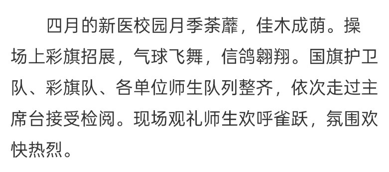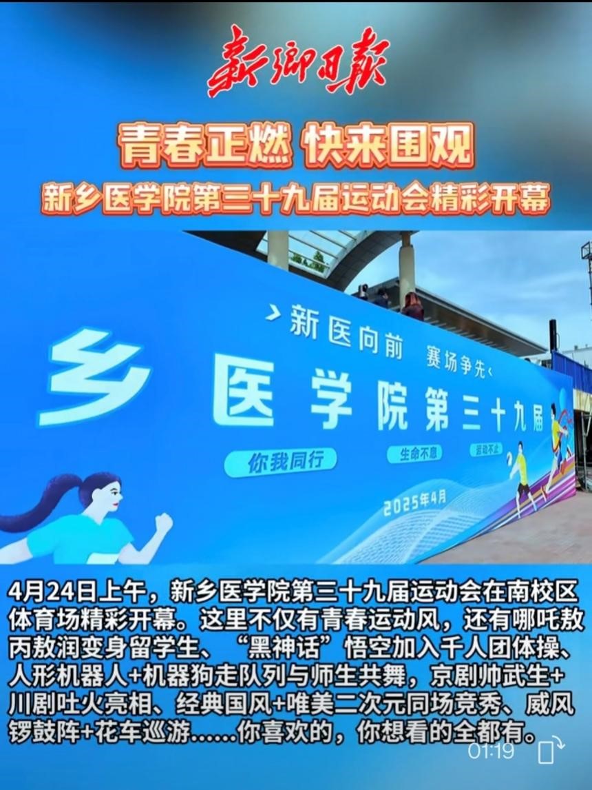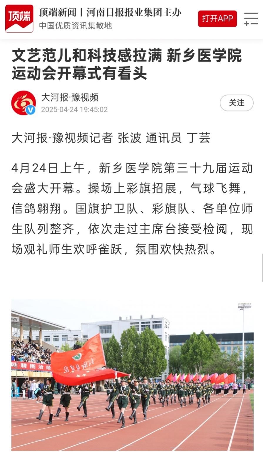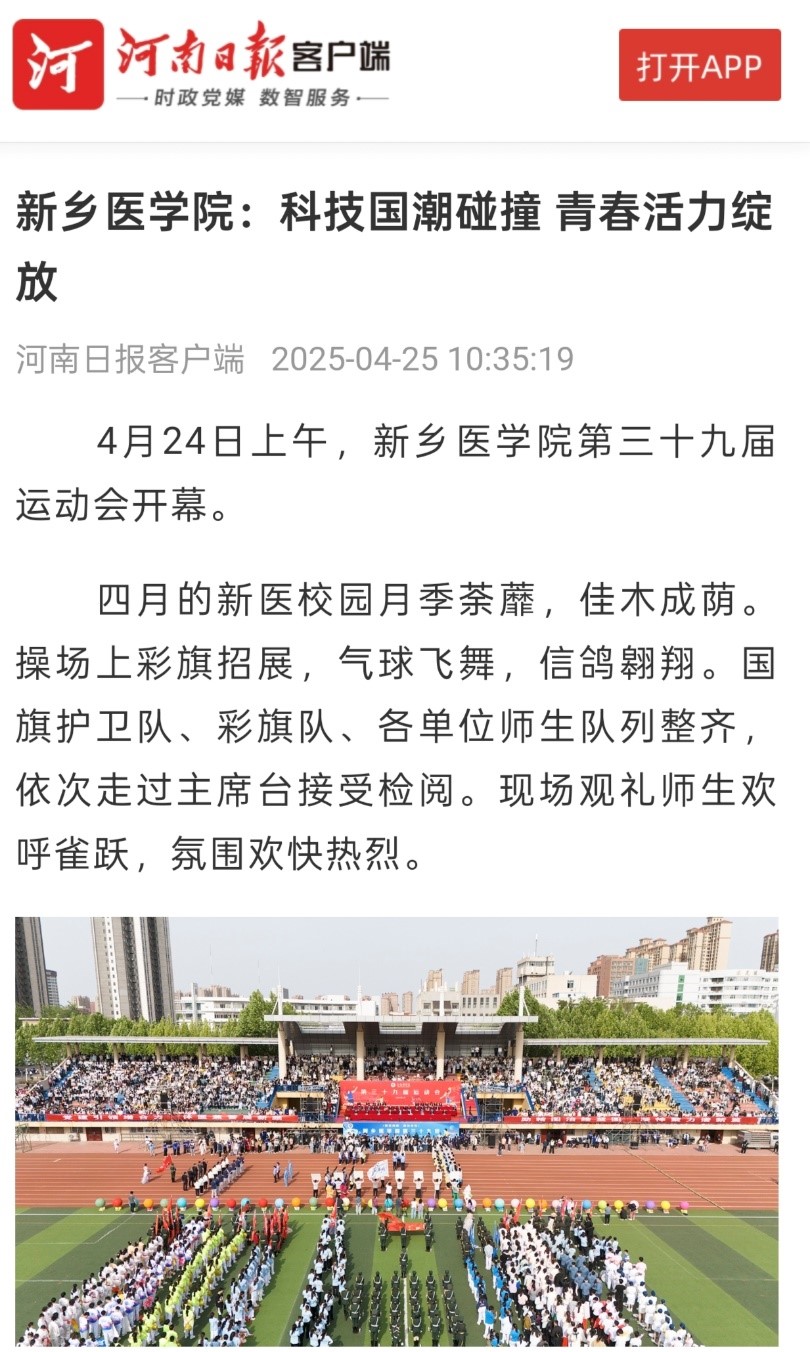 4月24日上午,我校第三十九届运动会开幕。开幕式上,各单位的方阵表演精心编排,创意十足,各种惊喜“组合”接连出场,“文艺范儿”和“科技感”拉满,呈现出丰富多元、兼容并蓄的文化特征,彰显了新医人奋力拼搏、笃行不怠的精神追求,为全校师生带来一场富有文化气息和科技感的视觉盛宴。河南日报客户端、顶端新闻、大河报•豫视频等多家媒体报道。