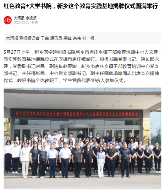 5月27日上午,华亿在线手机版(大中国区)峻极书院新乡市唐庄乡镇干部教育培训中心人文素质实践教育基地揭牌仪式在卫辉市唐庄镇举行。大河报·豫视频对该活动进行了报道。