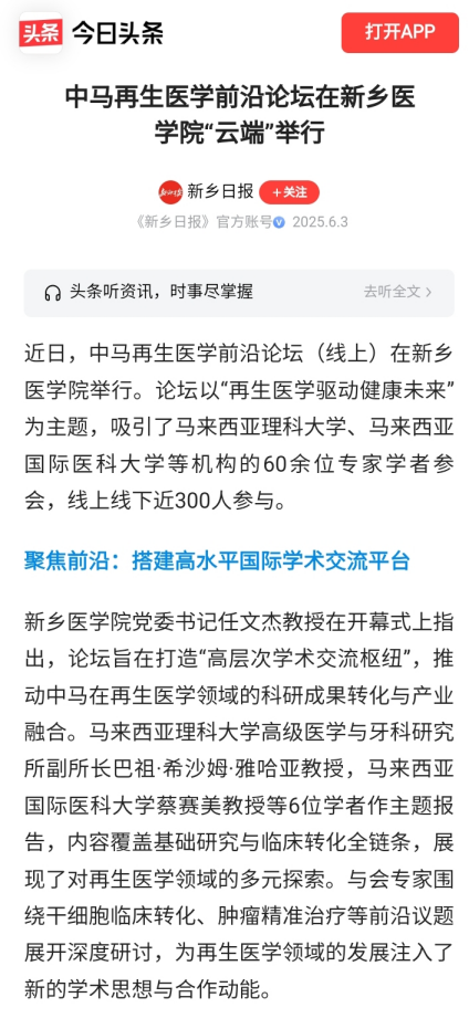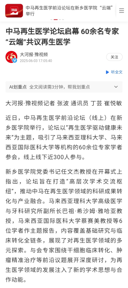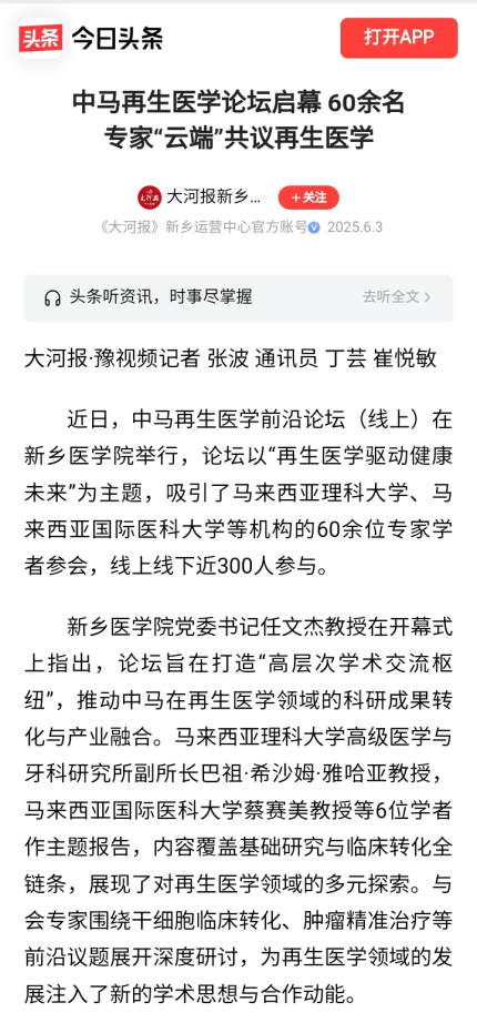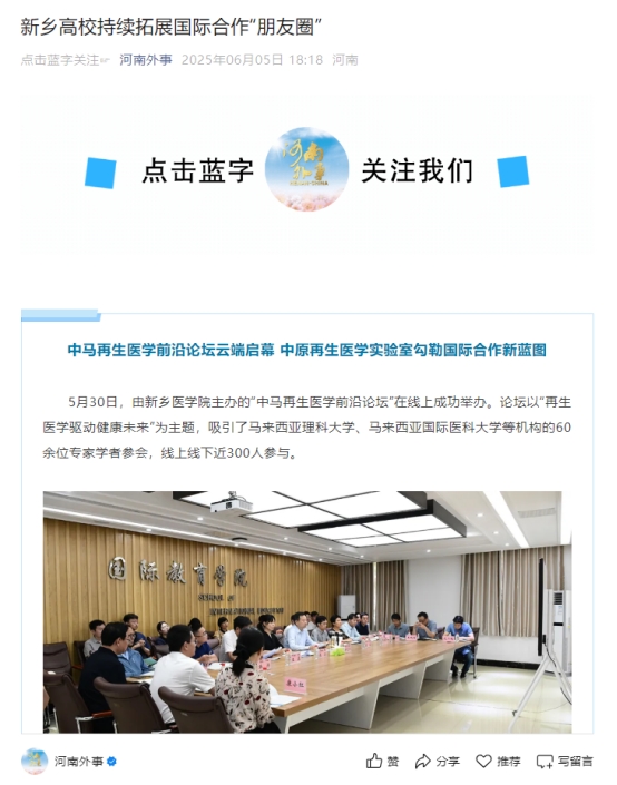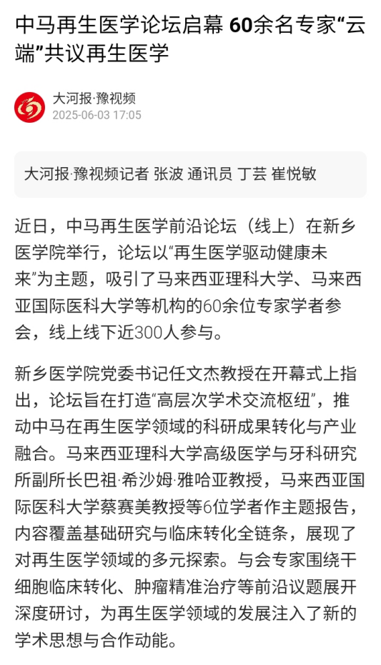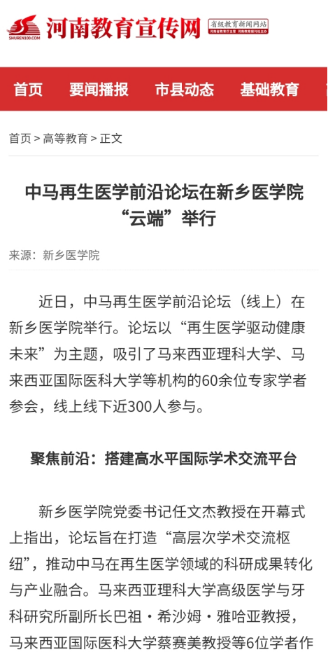 近日,中马再生医学前沿论坛(线上)在我校举行,论坛以“再生医学驱动健康未来”为主题,吸引了马来西亚理科大学、马来西亚国际医科大学等机构的60余位专家学者参会,线上线下近300人参与。本次论坛的举办标志着中马三所高校在医学科技领域的合作迈向更深层次。下一步我校将以中原再生医学实验室为依托,持续拓展与马来西亚高校的科研合作,通过“联合攻关+成果共享+产业联动”模式,为构建人类卫生健康共同体贡献智慧与力量。顶端新闻、大河报•豫视频、今日头条、河南外事等多家媒体报道。