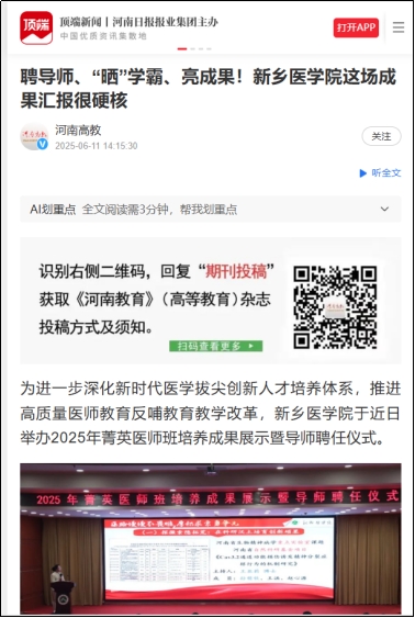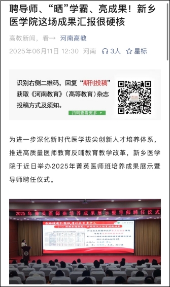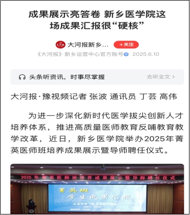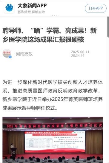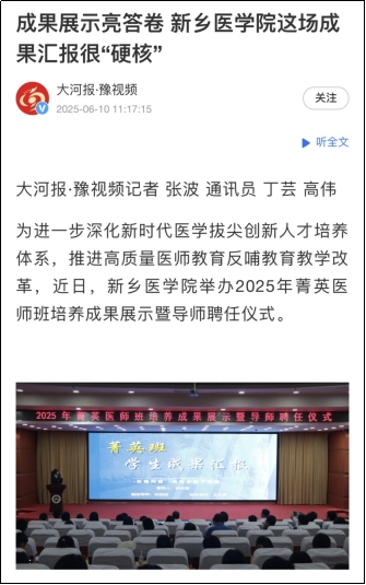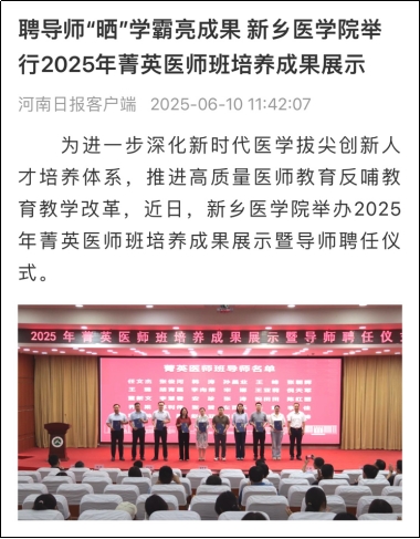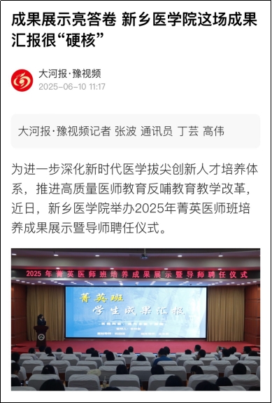 为进一步深化我校新时代拔尖创新人才培养体系,推进菁英医师教育反哺教育教学改革,6月6日晚7点,我校于第一报告厅举办2025年菁英医师班培养成果展示暨导师聘任仪式。作为河南省医学教育的重要创新实践,峻极书院临床医学专业“菁英医师班”自2022年创办以来,始终以培养德才兼备、仁心仁术新时代医学领军人才为目标,构建了独具特色的“1+2+3+5+X+N”培养体系,取得了显著育人成效。顶端新闻、大象新闻、大河报•豫视频、今日头条(大河报新乡新闻)、河南高教等多家媒体报道。