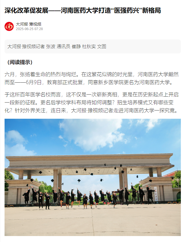 【大河报】大篇幅报道我校深化改革再推进 打造“医强药兴”新格局