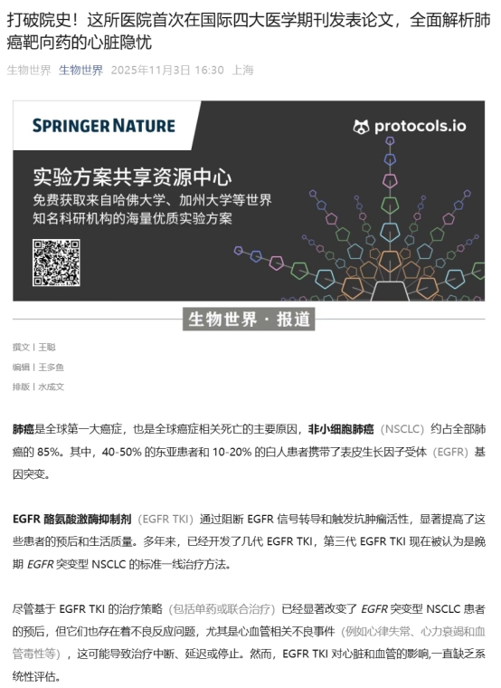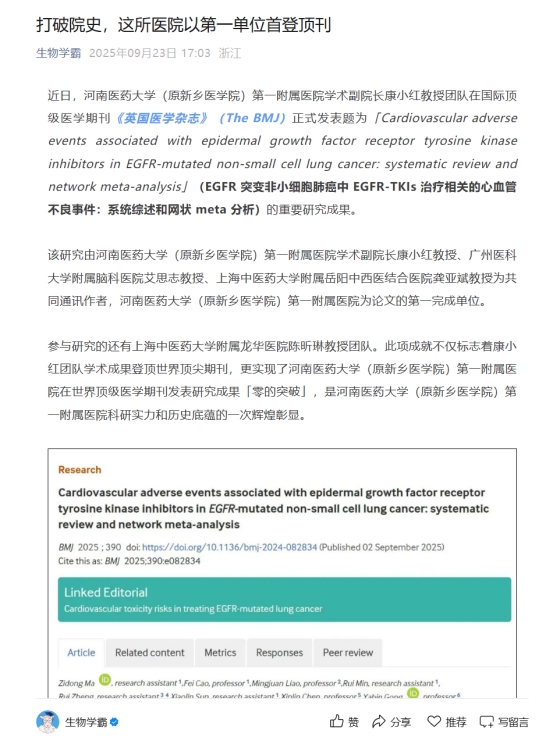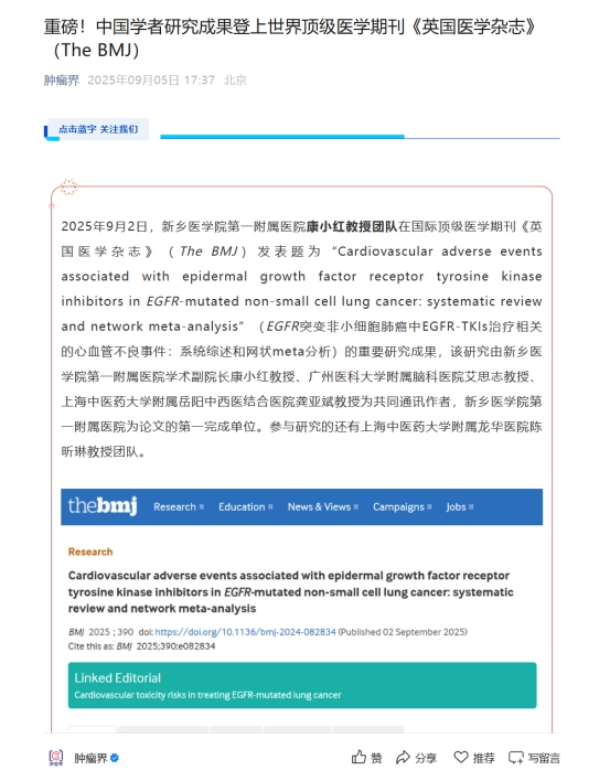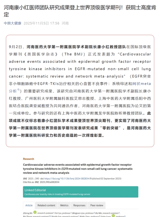 近日,我校第一附属医院学术副院长康小红教授团队在国际顶级医学期刊《英国医学杂志》(The BMJ)正式发表题为“Cardiovascular adverse events associated with epidermal growth factor receptor tyrosine kinase inhibitors in EGFR-mutated non-small cell lung cancer: systematic review and network meta-analysis”(EGFR突变非小细胞肺癌中EGFR-TKIs治疗相关的心血管不良事件:系统综述和网状meta分析)的重要研究成果,该研究由康小红教授、广州医科大学附属脑科医院艾思志教授、上海中医药大学附属岳阳中西医结合医院龚亚斌教授为共同通讯作者,第一附属医院为论文的第一完成单位。参与研究的还有上海中医药大学附属龙华医院陈昕琳教授团队。此项成就不仅标志着康小红团队学术成果登顶世界顶尖期刊,更实现了第一附属医院在世界顶级医学期刊发表研究成果“零的突破”,是其科研实力和历史底蕴的彰显。