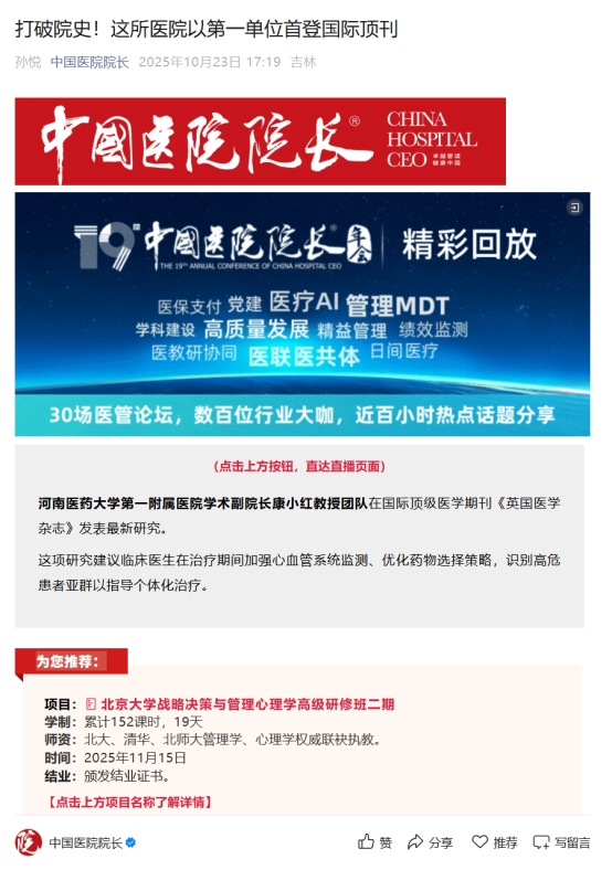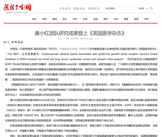 【河南日报、医药卫生网、河南青年网、丁香学术】等媒体报道我校第一附属医院研究成果登上《英国医学杂志》