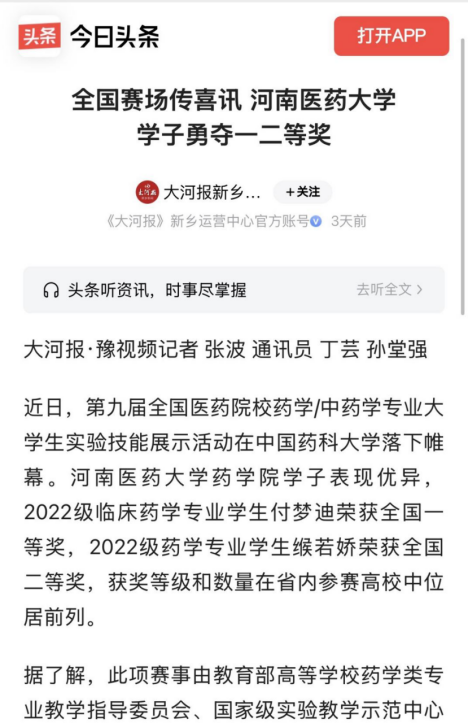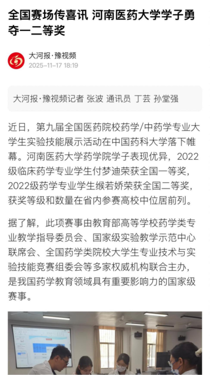近日,第九届全国医药院校药学/中药学专业大学生实验技能展示活动在中国药科大学落下帷幕。我校药学院学子表现优异,2022级临床药学专业学生付梦迪荣获全国一等奖,2022级药学专业学生缑若娇荣获全国二等奖,获奖等级和数量在省内参赛高校中位居前列。多家媒体报道。