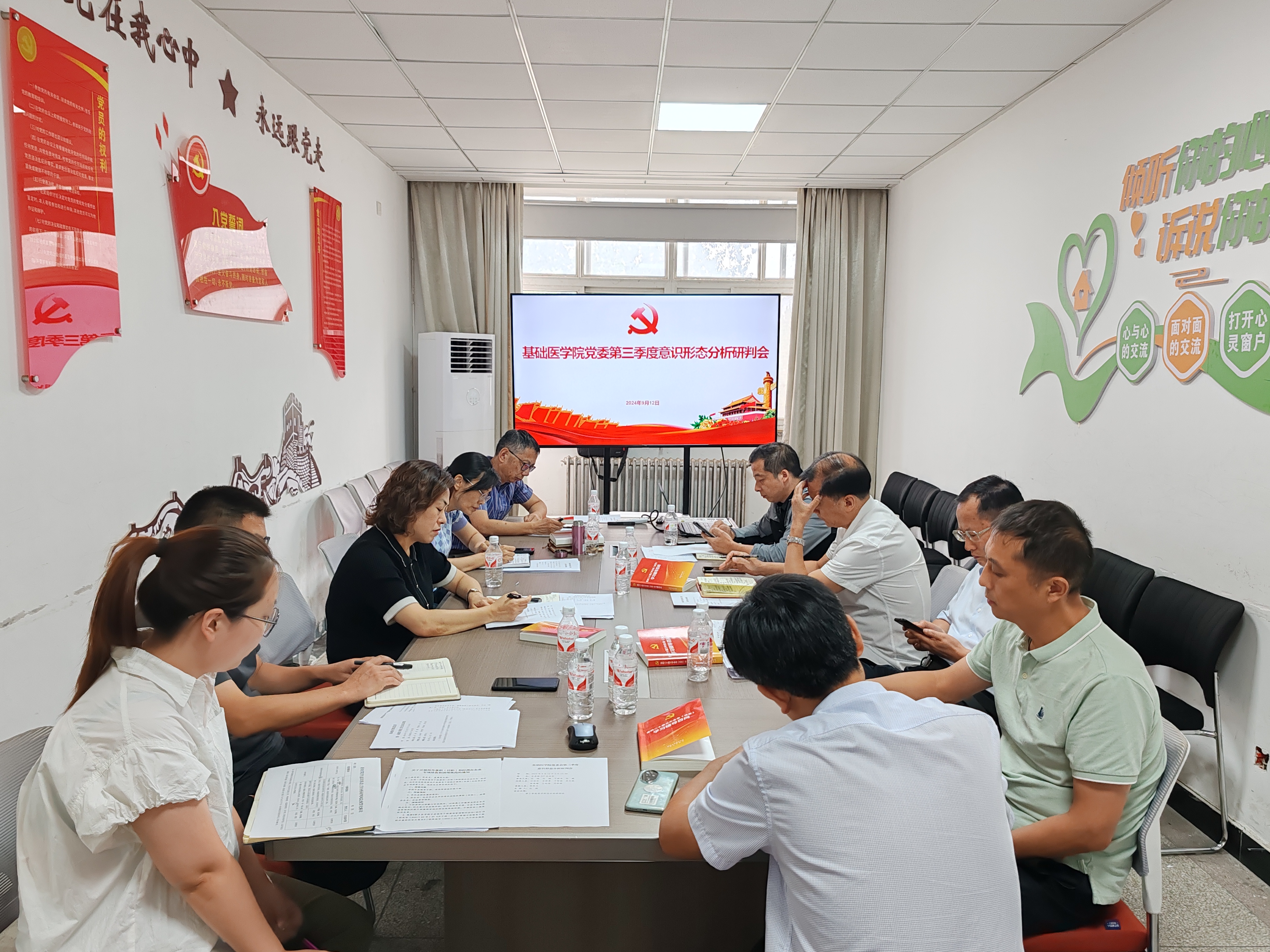 9月12日下午,基础医学院党委在求真楼东配楼二楼237会议室召开2024年第三季度意识形态分析研判会。党政领导班子全体人员、党政办公室、学生工作办公室、团委、教学管理与专业建设办公室、研究生培养与学位点建设办公室等科室负责人参加会议。会议由党委书记任峰主持。