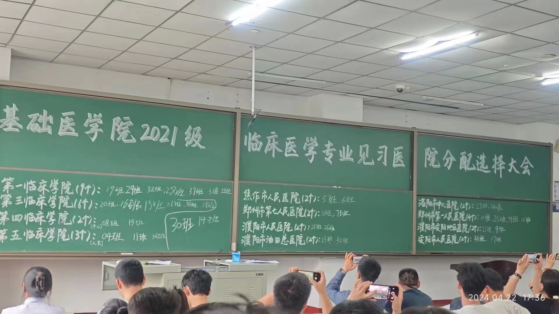 (文/郑佳、乔雨晴 图/葛龙岗)根据教务部《关于做好2024-2025学年实(见)习教学工作的通知》的具体要求,本着公平、公正、公开的原则,4月22日下午5点,我院在博学楼3204教室举行了2021级临床医学专业见习医院分配选择大会。会议由2021级辅导员刘丹洋主持召开,基础医学院党委副书记白婕、基础医学院千智斌教授、基础医学院学工办主任张晨曦、基础医学院教学办副主任邓保国、2021级辅导员郑佳、2021级临床专业所有班长、团支及各班民主代表等参加本次会议。