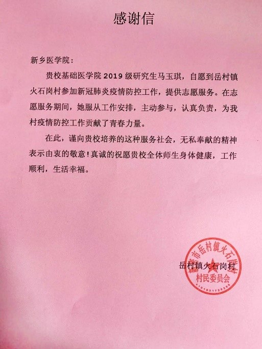 近日,学校收到一封来自新密市岳村镇火石岗村的感谢信,信中感谢我院2019级研究生马玉琪为村里疫情防控所作出的贡献。