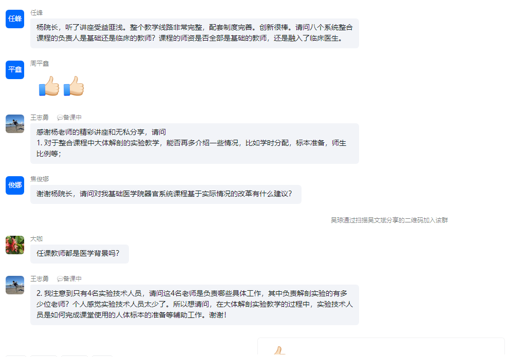 在问答互动环节,多位教师积极提问,余院长与杨院长都一一耐心解答、分享经验和观点,与大家进行专业性讨论,提出了自己的见解及建议。