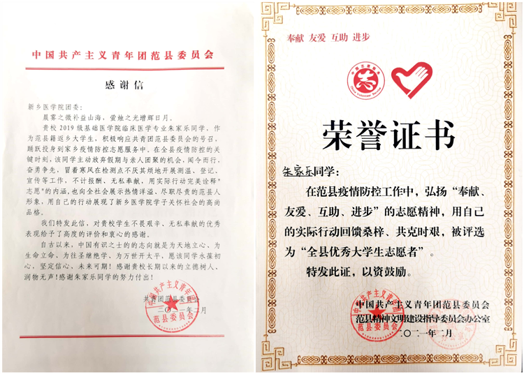 (文/图 陈龙飞)近日,共青团范县委员会向我校团委发来了一封感谢信,感谢并表彰了我校基础医学院2019级临床医学专业学生朱家乐在全县疫情防控的关键时刻,主动放弃假期与亲人团聚的机会,参与家乡疫情防控的事迹,给予他高度评价和诚挚谢意。一封简单的感谢信折射了我校青年学子的成长、责任和担当。