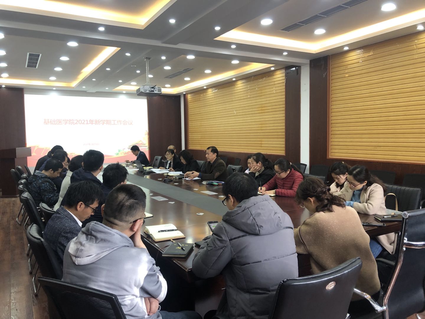 (文/图 张博)3月12日上午,基础医学院在新实验楼六楼第一会议室召开了2021年度工作会议。会议学习了全省教育系统全面从严治党工作视频会议及学校2021年度工作会议精神,总结学院2020年工作,科学分析形势任务,明确2021年重点工作,为“十四五”开好局、起好步奠定坚实基础。基础医学院院长任峰,基础医学院与法医学院党委副书记李照勇、白婕,基础医学院副院长高福莲、赵晓生出席会议,学院全体党支部书记、科室负责人参加会议。会议由白婕主持。