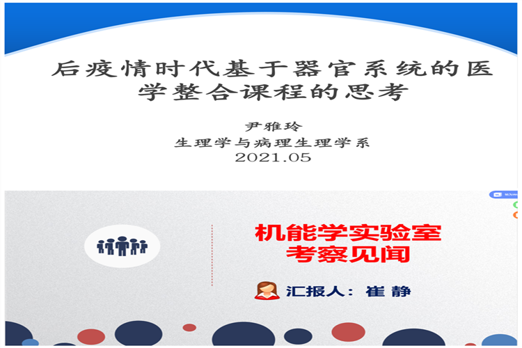 本次考察学习,行程紧凑,安排科学,各科室、学系主任在考察过程中对照自身专业建设条件进行学习,在两个医科大学分别考察了不同风格的专业建设管理模式,考察学习中受益匪浅,感触颇深。此次交流汇报会围绕专业建设考察、实验室考察、后疫情时代基于器官系统的医学整合课程的思考以及机能学实验室考察见闻等几个方面做了汇报,和大家深入探讨了专业建设的开展情况、学习心得及经验分享,线上还和大家进行了充分的交流和讨论,并结合考察心得提出了下一步具体工作方案,真正体现了考察学习的意义和价值。