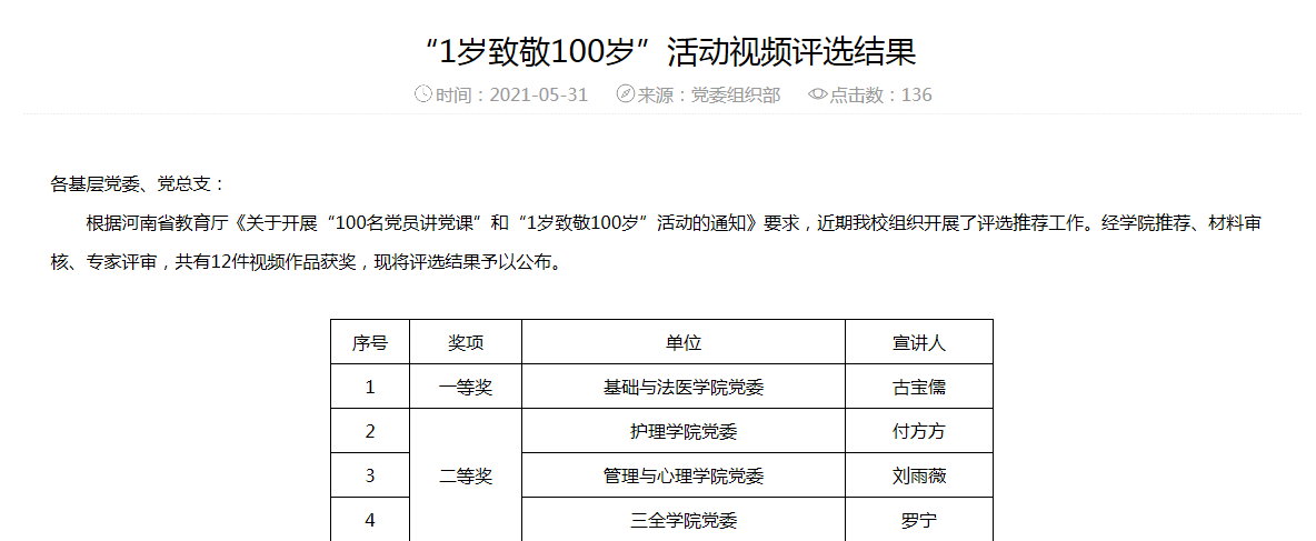 (文/赵玥彤 古宝儒)为扎实做好党史学习教育,回顾党的光辉历程,讴歌党的丰功伟绩,继承和发扬党的优良传统。根据河南省教育厅《关于开展“一岁致敬一百岁”活动的通知》要求,学校开展了“一岁致敬一百岁”宣讲活动。活动通知一经下达,我院党委高度重视,立刻开启动员选拔,最终推选2018级古宝儒同学代表基础与法医学院党委参加此次活动,经认真周密的准备,通过材料审核,专家评审,最终荣获一等奖的好成绩。该视频一经学校官方公众号播出就收到了来自老师与学生们的广泛好评。
