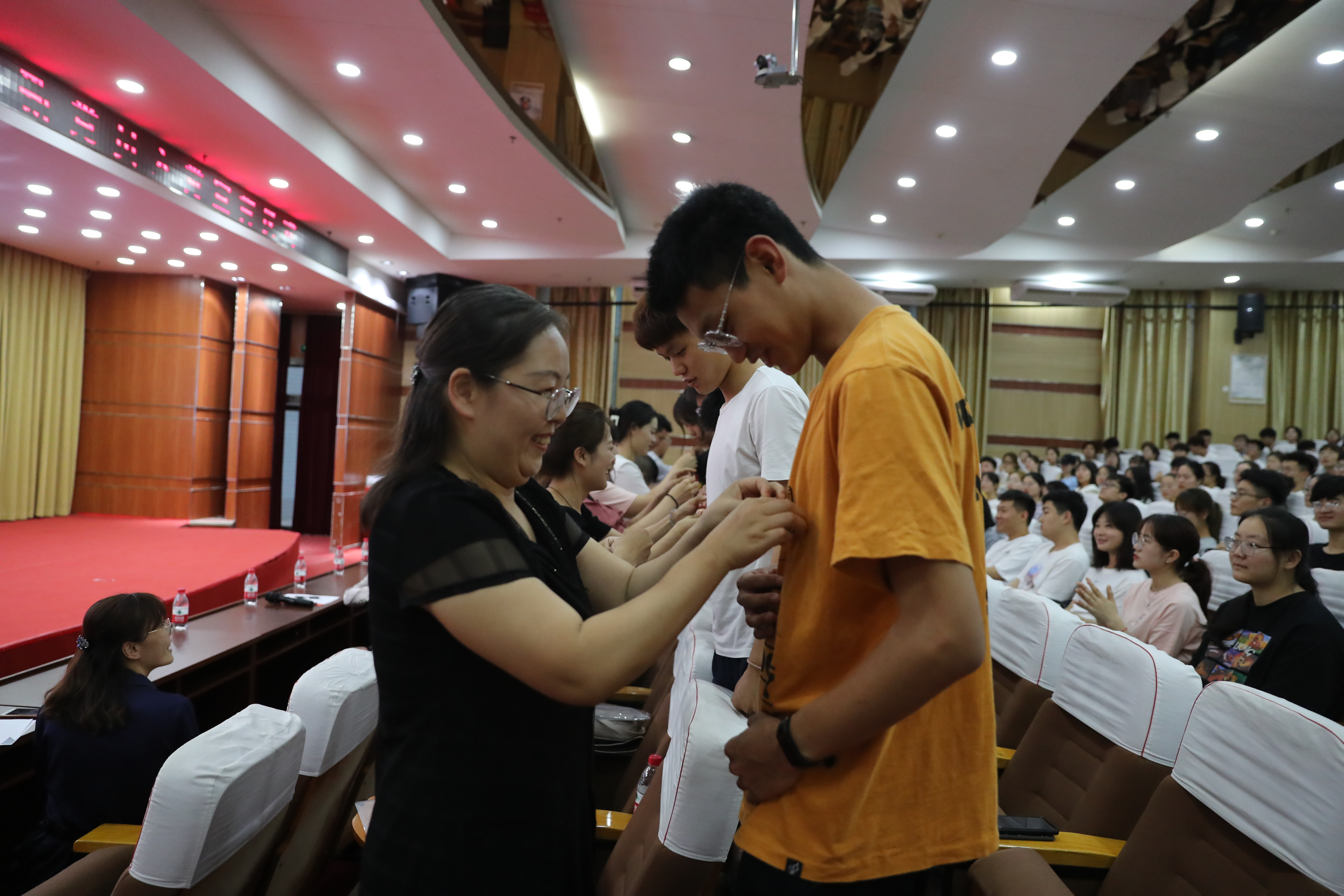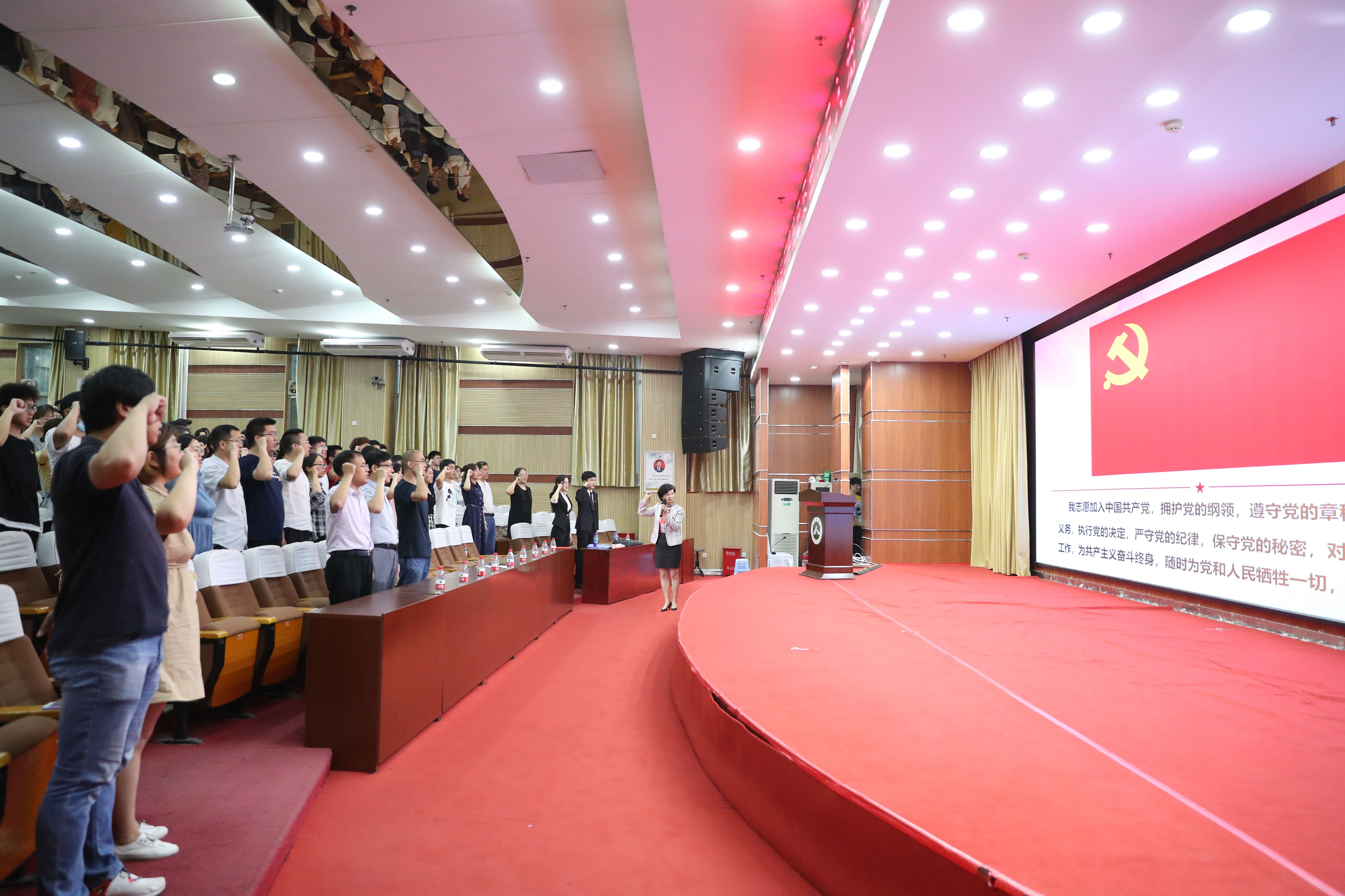 仪式在雄壮的《国际歌》声中拉开帷幕,老党员代表亲自为新党员佩戴党徽,赠送入党礼物。王宏玲带领全体党员面向党旗庄严宣誓,“我志愿加入中国共产党,拥护党的纲领,遵守党的章程……”,一句句响亮的青春誓言,表达出了青年党员们为党的事业肩负起时代责任和民族使命的坚定决心。
