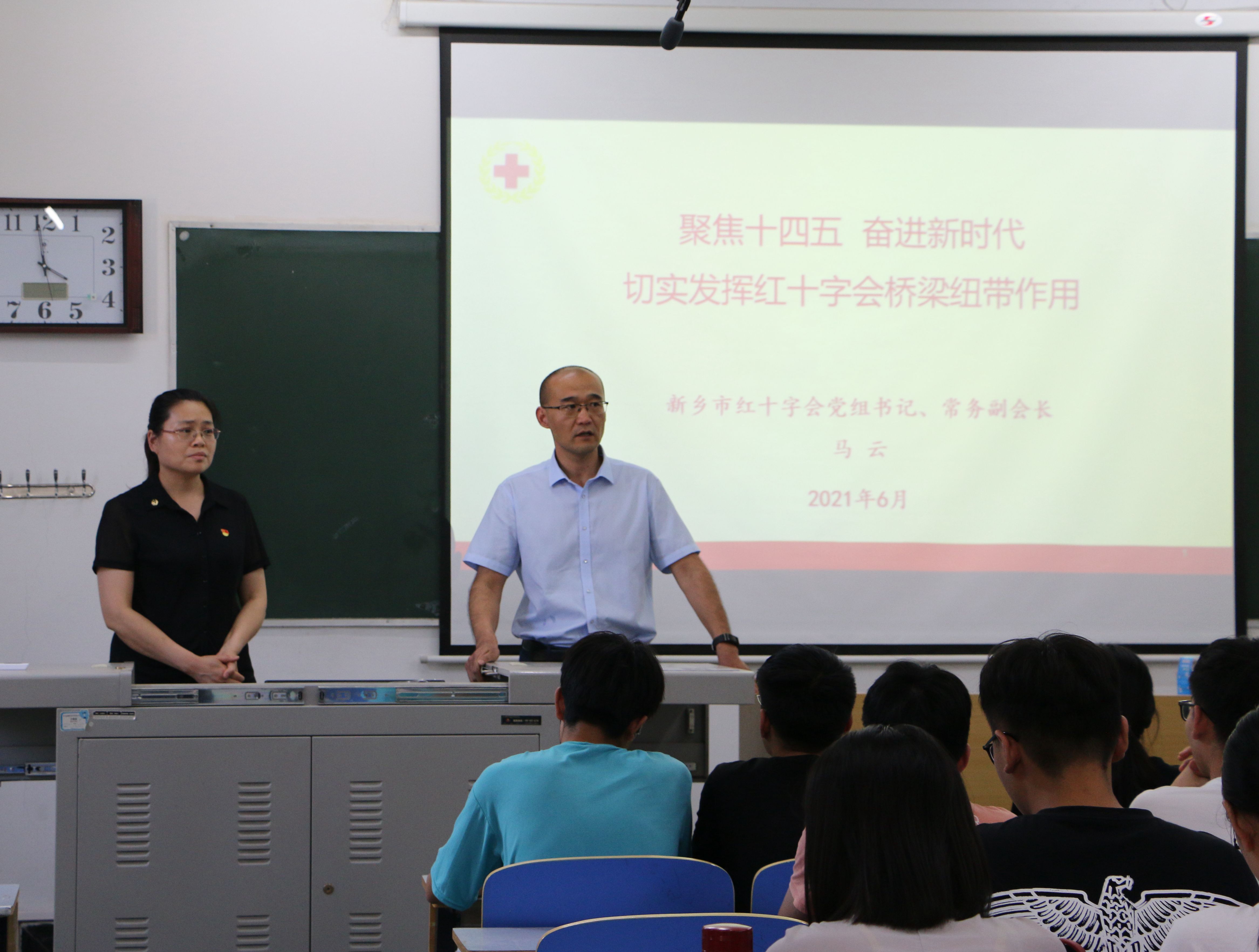 (文/图 李雪莹)百年征程波澜壮阔,百年初心历久弥坚。为加强党史学习教育,从党的奋斗历史中汲取前进力量,树立学生不忘初心跟党走的坚定信念,以昂扬向上的精神面貌迎接党的百年华诞,6月21日,我院邀请到新乡市红十字会党组书记、常务副会长马云,在第二教学楼2104教室为我院大学生作党史学习教育宣讲。她结合我院专业特色,以聚焦十四五,奋进新时代,切实发挥红十字会桥梁纽带作用为主题,扎实推进党史学习教育。