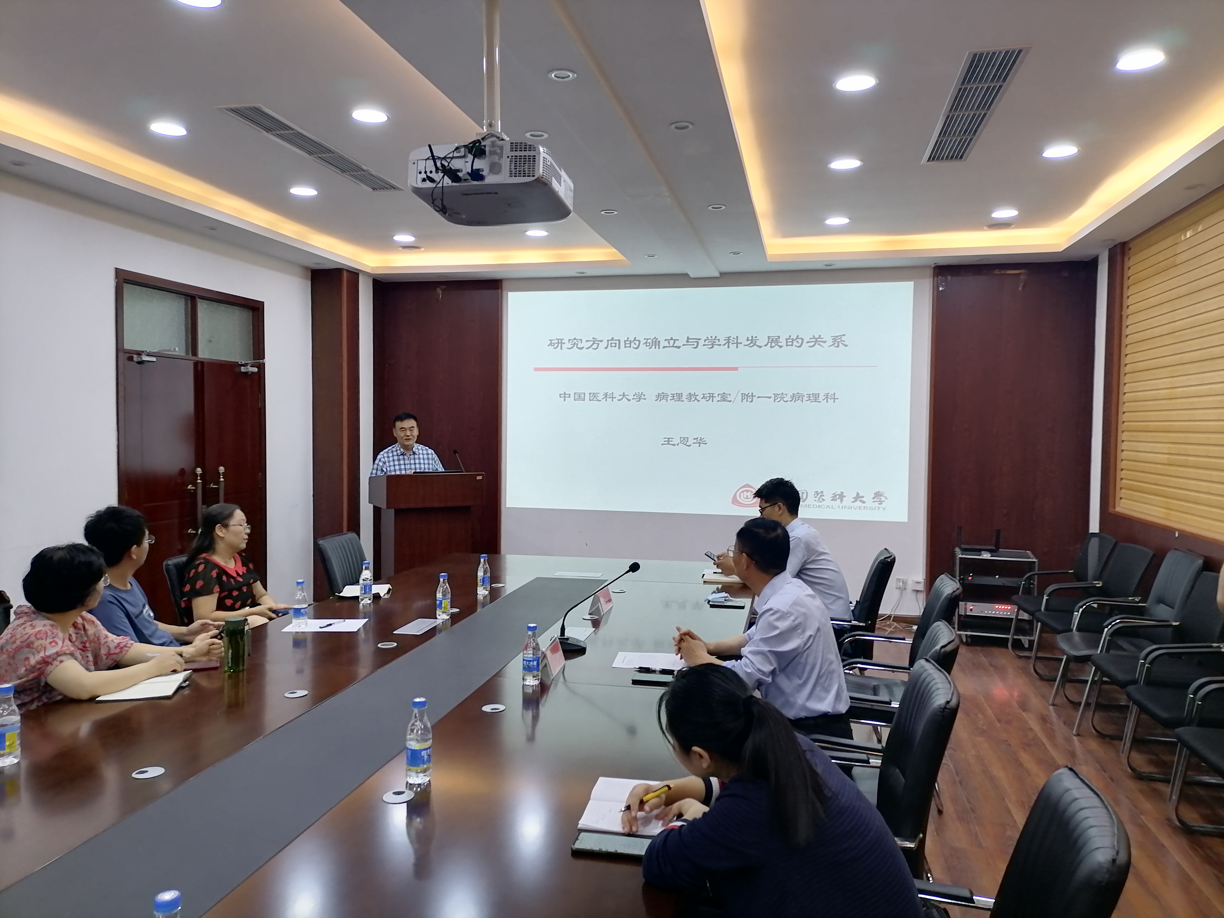 (文/朱会芳 图/贺国洋)2021年7月10日,基础医学院“卓越论坛”系列讲座第六期在新实验大楼六楼会议室进行。中国医科大学附属第一医院博士生导师王恩华教授应邀做了题为“研究方向的确立与学科发展的关系”的学术报告。本次报告会由基础医学院副院长千新来主持,学院有关学科带头人、青年教师、研究生聆听了本次报告。