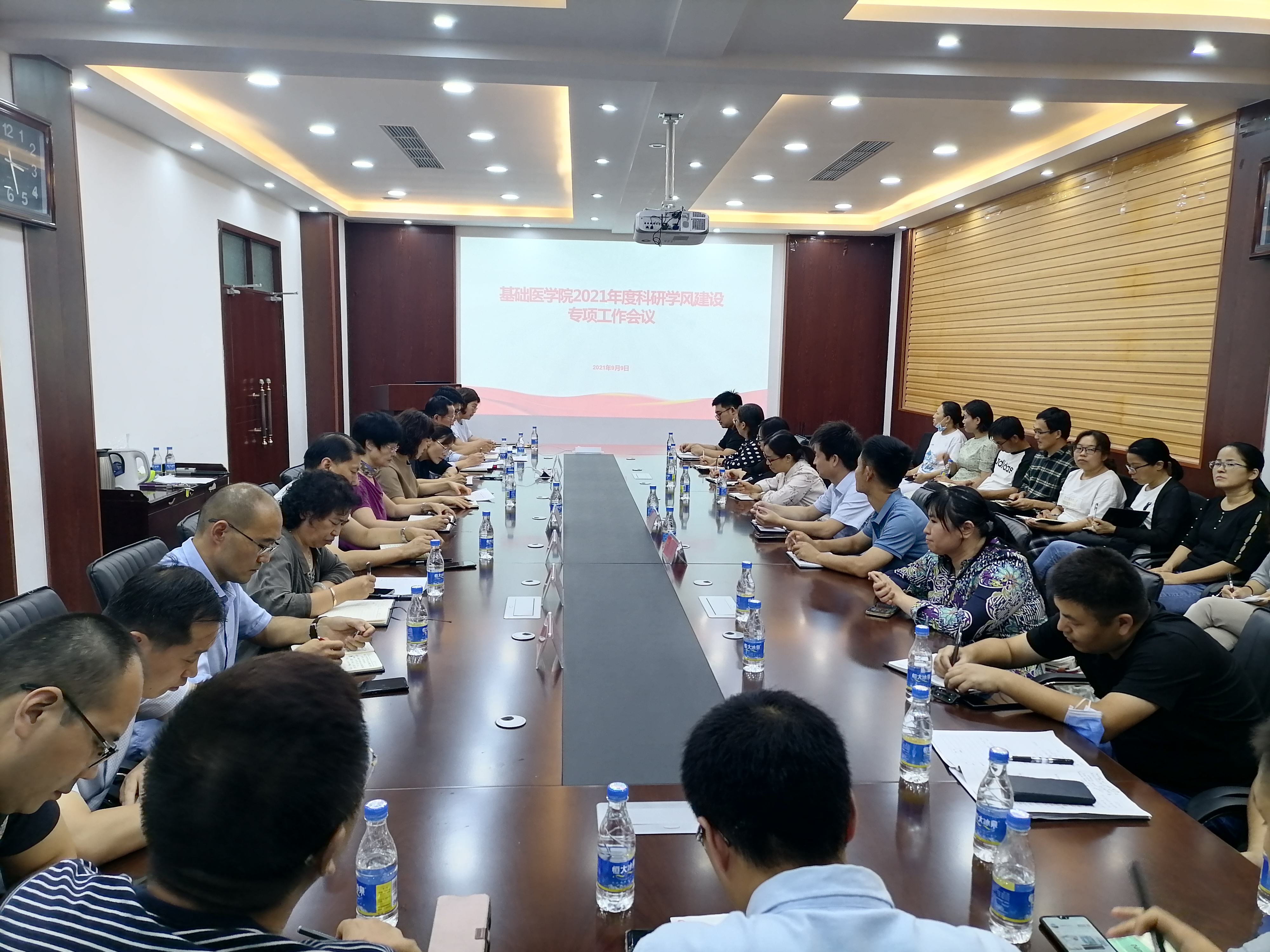 (文/王帅 图/吴文斌)为深入贯彻落实学校科研学风建设专项会议精神,加强我院学术诚信建设,营造良好的学术环境,9月9日下午,我院在新实验楼六楼会议室召开科研学风建设专项会议。科技处副处长焦石文和有关负责人、基础医学院与法医学院党委书记王宏玲、基础医学院院长任峰、基础医学院与法医学院党委副书记李照勇和白婕、基础医学院副院长高福莲、千新来和赵晓生出席会议,学院全体科级干部和支部书记参加会议并认真学习会议精神。