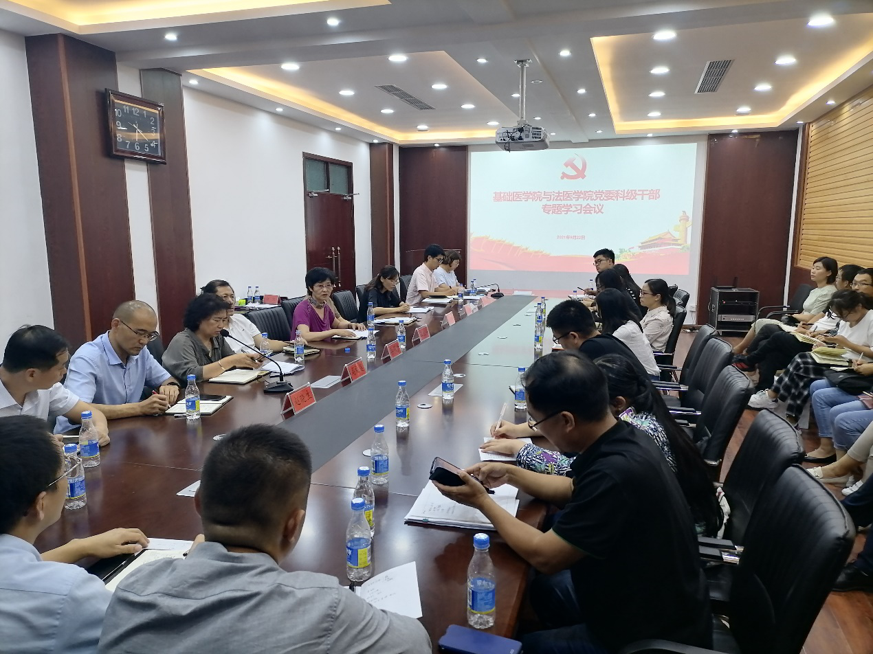 (文/图 吴文斌)9月9日下午,基础医学院与法医学院党委召开科级干部专题学习会议,基础医学院与法医学院党委书记王宏玲,基础医学院院长任峰,基础医学院与法医学院党委副书记李照勇、白婕,基础医学院副院长高福莲、千新来、赵晓生出席会议。基础医学院学系、实验室主任、副主任及各党支部书记参加。