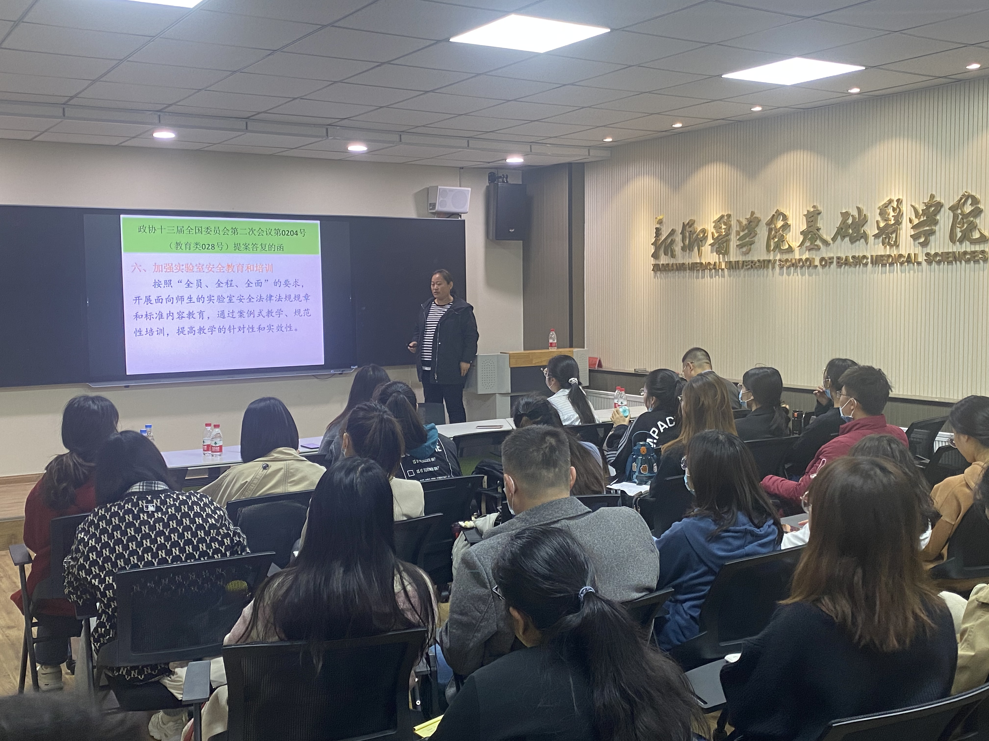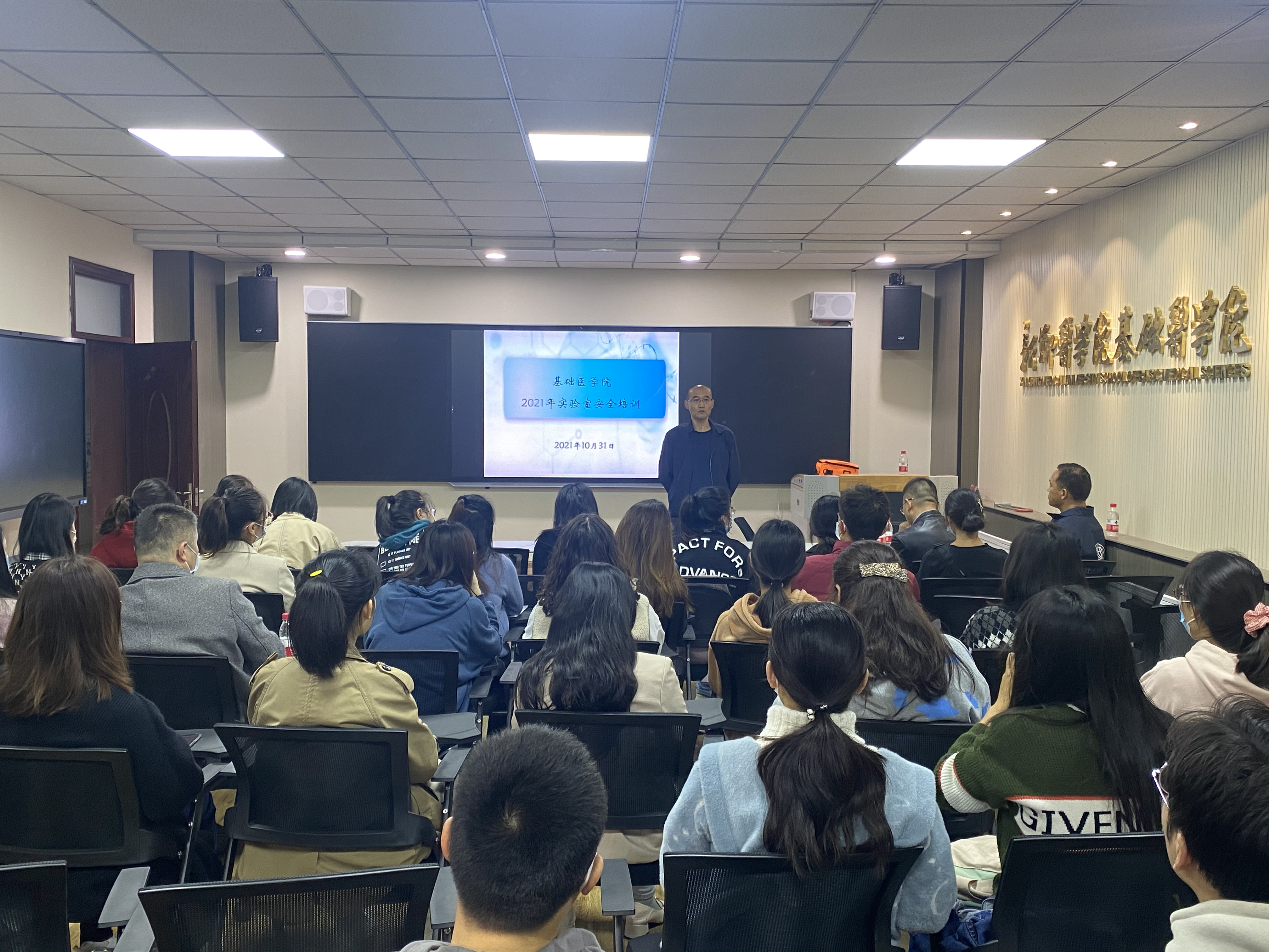 (文/图 周平鑫)为提高我院师生实验室安全意识,保障师生人身安全,维护教学、科研工作的正常秩序,创建“平安校园”。10月31日上午,我院联合保卫处开展了2021-2022年度实验室安全培训会议,培训会邀请安全健康教育网新乡站赵海涛教官、分析测试实验室主任吴宏伟博士、病原生物学与免疫学实验室主任王翠玲博士作培训讲座,会议由赵晓生副院长主持。2020年9月以来我院新进教师、2021级研究生参加会议。