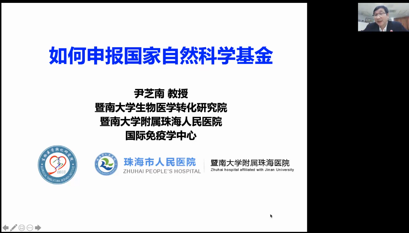 (文/图 陈彩丽)2021年12月20日,基础医学院“卓越论坛”系列讲座第九期在新实验大楼四楼教师教学实训基地顺利举行。暨南大学生物医学转化研究院院长尹芝南教授应免疫学系邀请,向全院师生做了题为“如何申报国家自然科学基金”的专题报告。本次报告会线上线下同步开展,由基础医学院副院长千新来主持,学院有关学科带头人、青年教师聆听了本次报告。