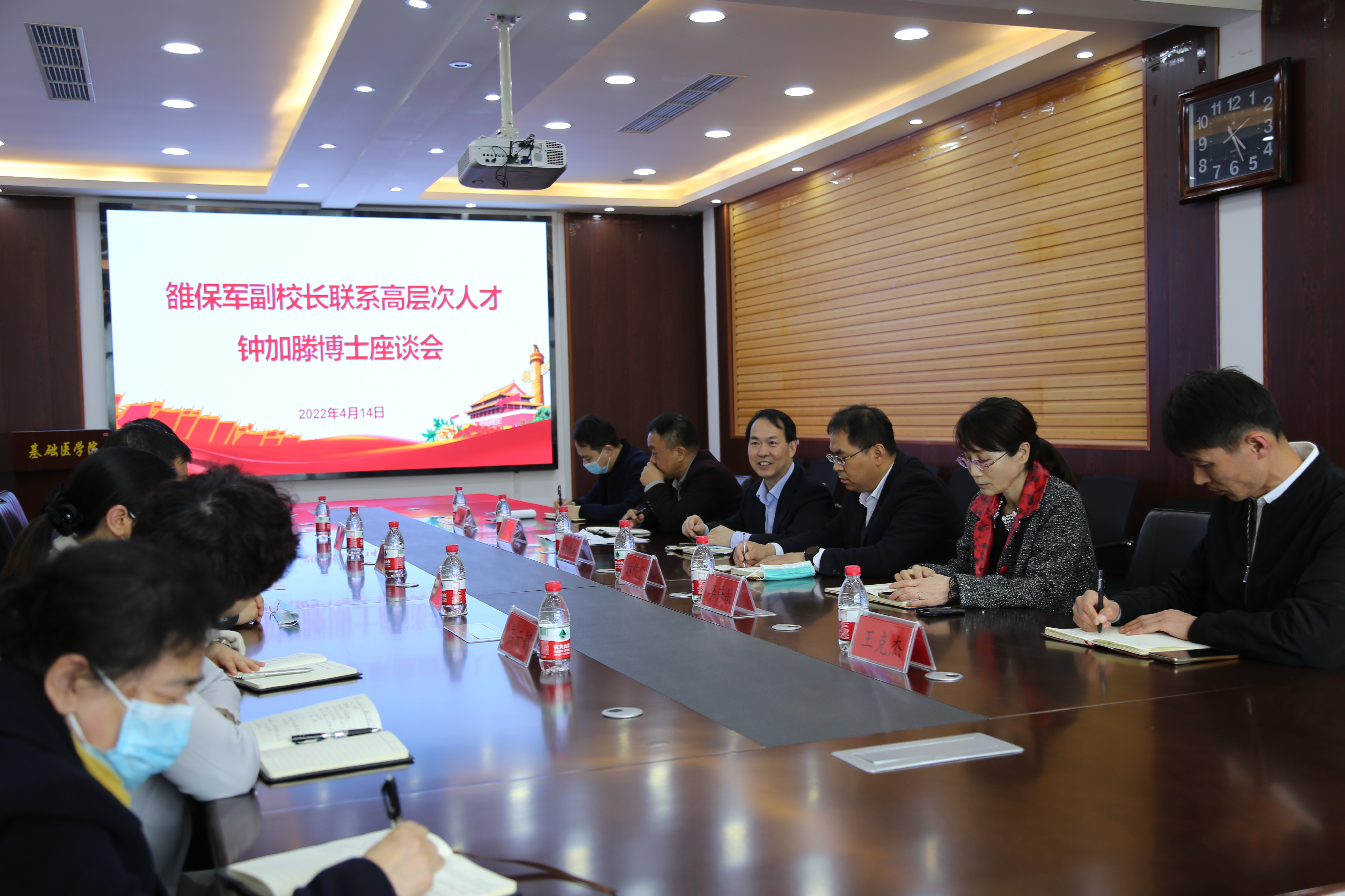 雒保军督促基础医学院要加强对人才的引导和管理,为他们创造良好的工作条件和环境,充分利用高层次人才助推学校创新发展。他强调,当前学校正处于更名大学的关键时期,全校上下要坚持和落实党管人才原则,在全校形成人人尊重人才,人人服务人才的良好氛围。他勉励钟加腾博士,要紧紧围绕学校改革发展的战略需求,整合自身研究领域的优势和特色,引领学科发展,继续加大教学改革和创新的力度,“循道务实,守正创新”,力争实现新突破、取得新成就。学校将进一步优化环境,精心做好服务工作,搭建干事创业平台,让高层次人才发挥才能、施展才华,希望高层次人才继续在各自的岗位上继续发挥聪明才智,再接再厉,为建设特色鲜明的高水平医科大学贡献力量。