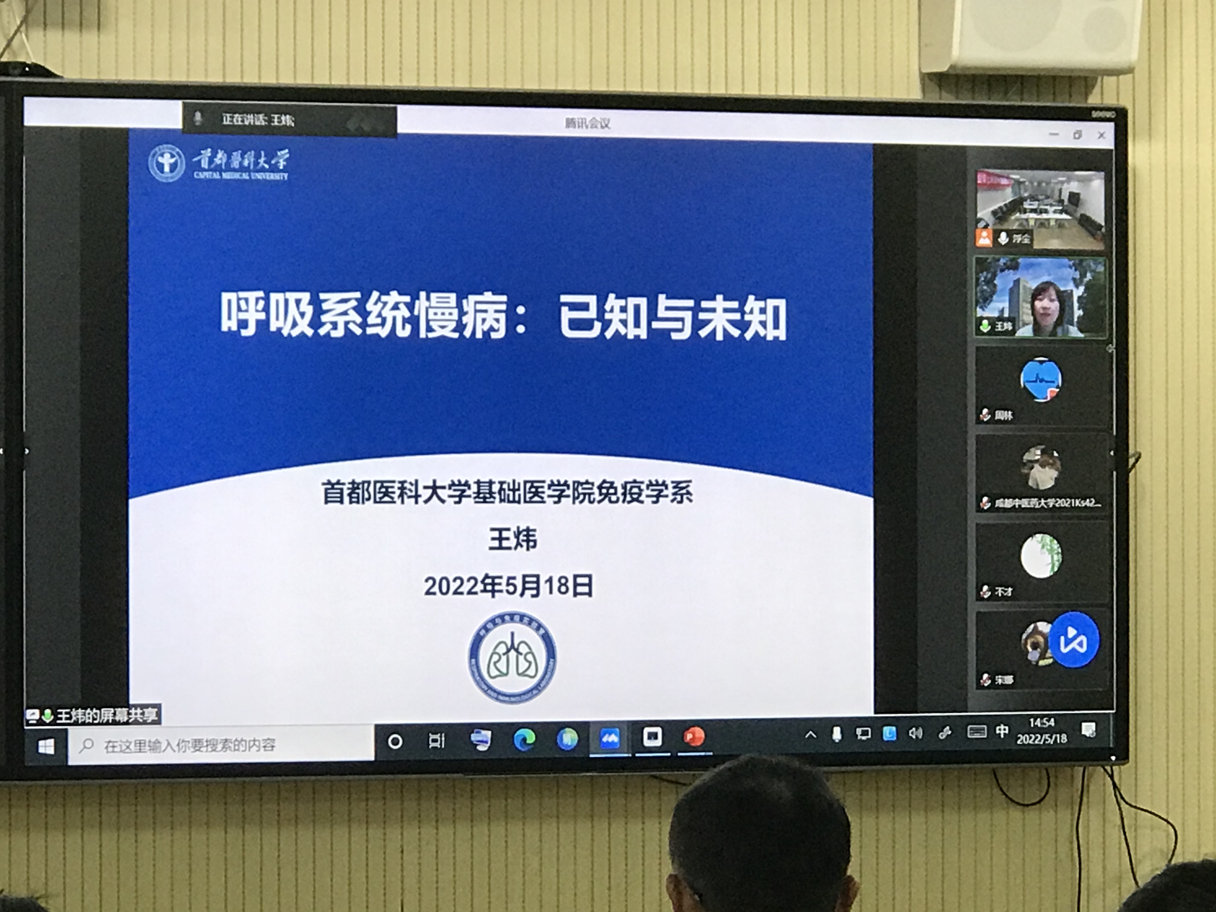 (文/图 杨子善)2022年5月18日,基础医学院“卓越论坛”系列讲座第十期在求是楼四楼教师教学技能实训基地顺利举行。首都医科大学基础医学院党委副书记兼副院长王炜教授应邀做了题为“呼吸系统慢病:已知与未知”的专题报告。本次报告由基础医学院副院长千新来主持,并于线上线下同步开展。学院有关学科带头人、青年教师、研究生聆听了本次报告。