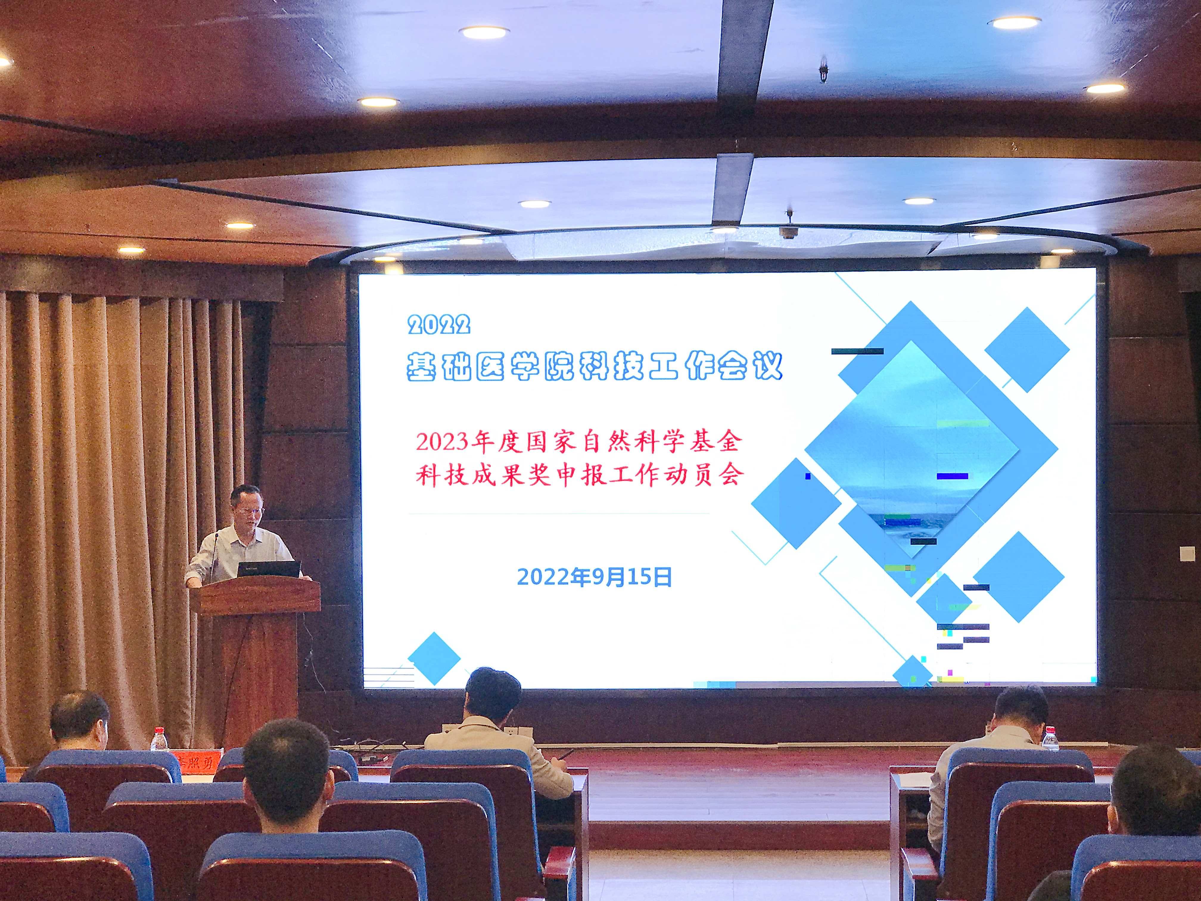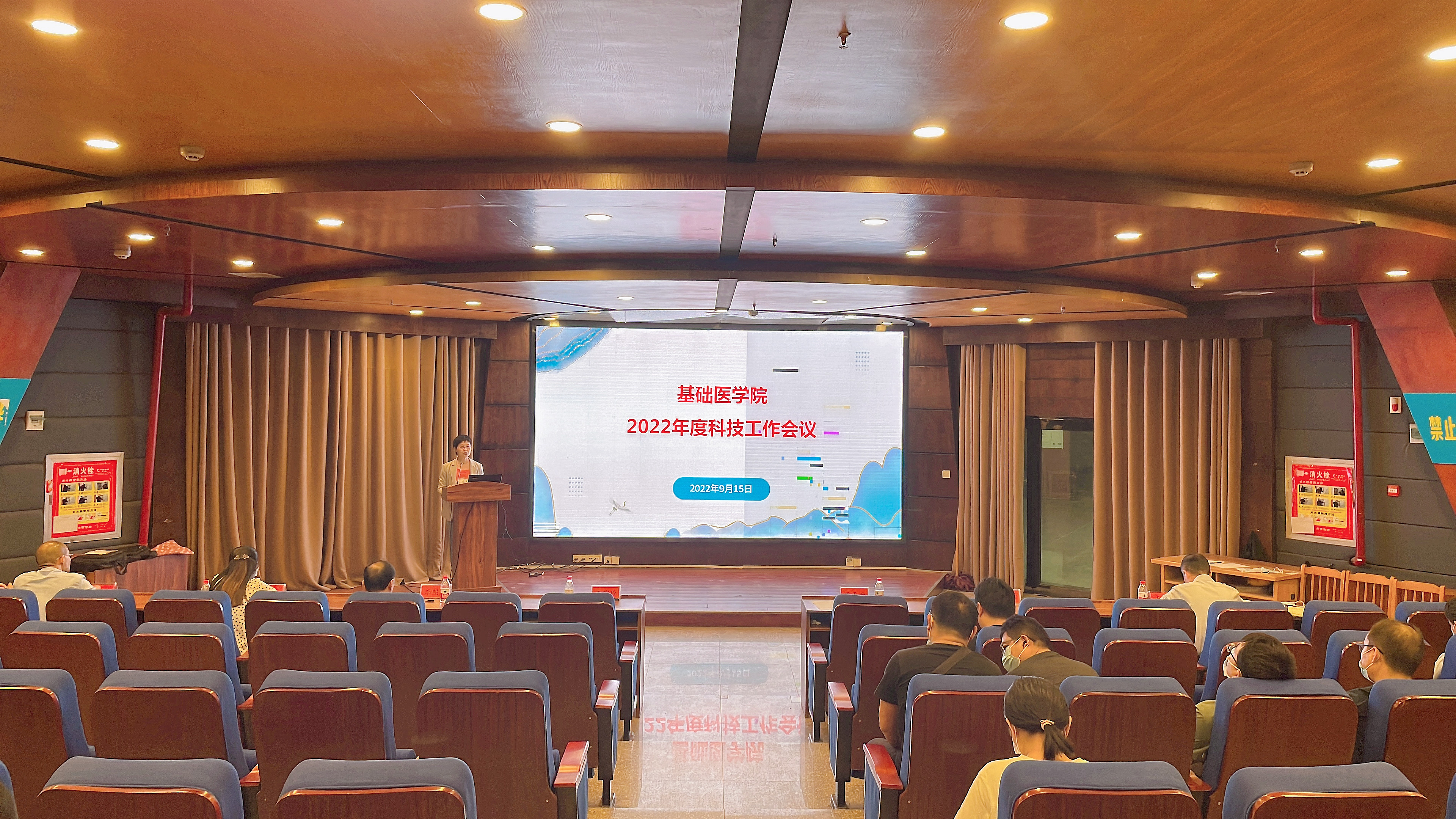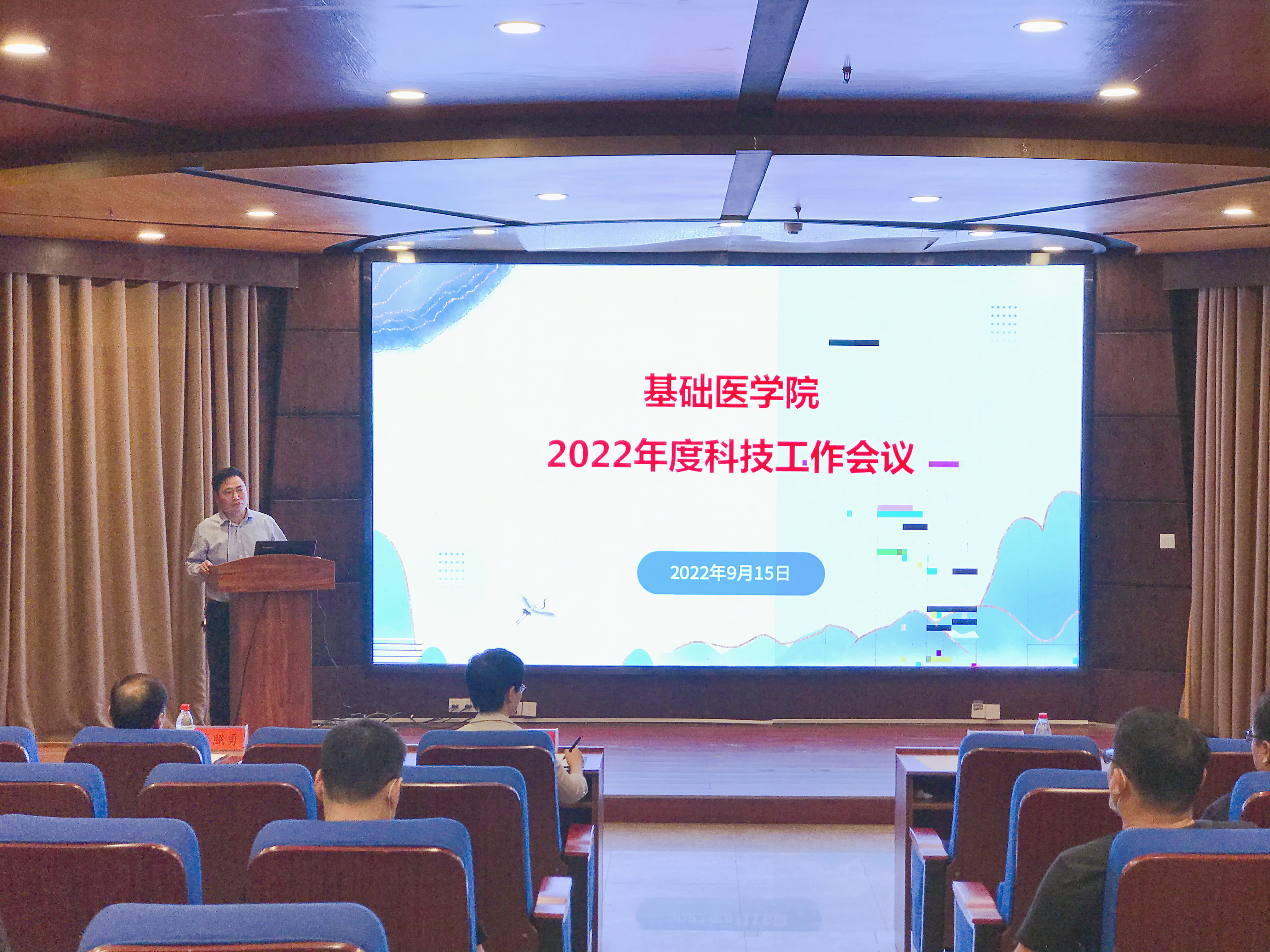 (文/王帅 图/赵兴华)2022年9月15日下午,我院2022年科技工作会议在老图书馆一楼报告厅召开。科技处处长王天云、科技处科技监督与诚信建设办公室主任王璐、基础医学院与法医学院党委书记王宏玲、副书记李照勇和白婕、基础医学院副院长千新来、赵晓生出席。学院各学系、实验室的负责人和业务教师参加了会议,会议由学院科研办主任王帅主持。