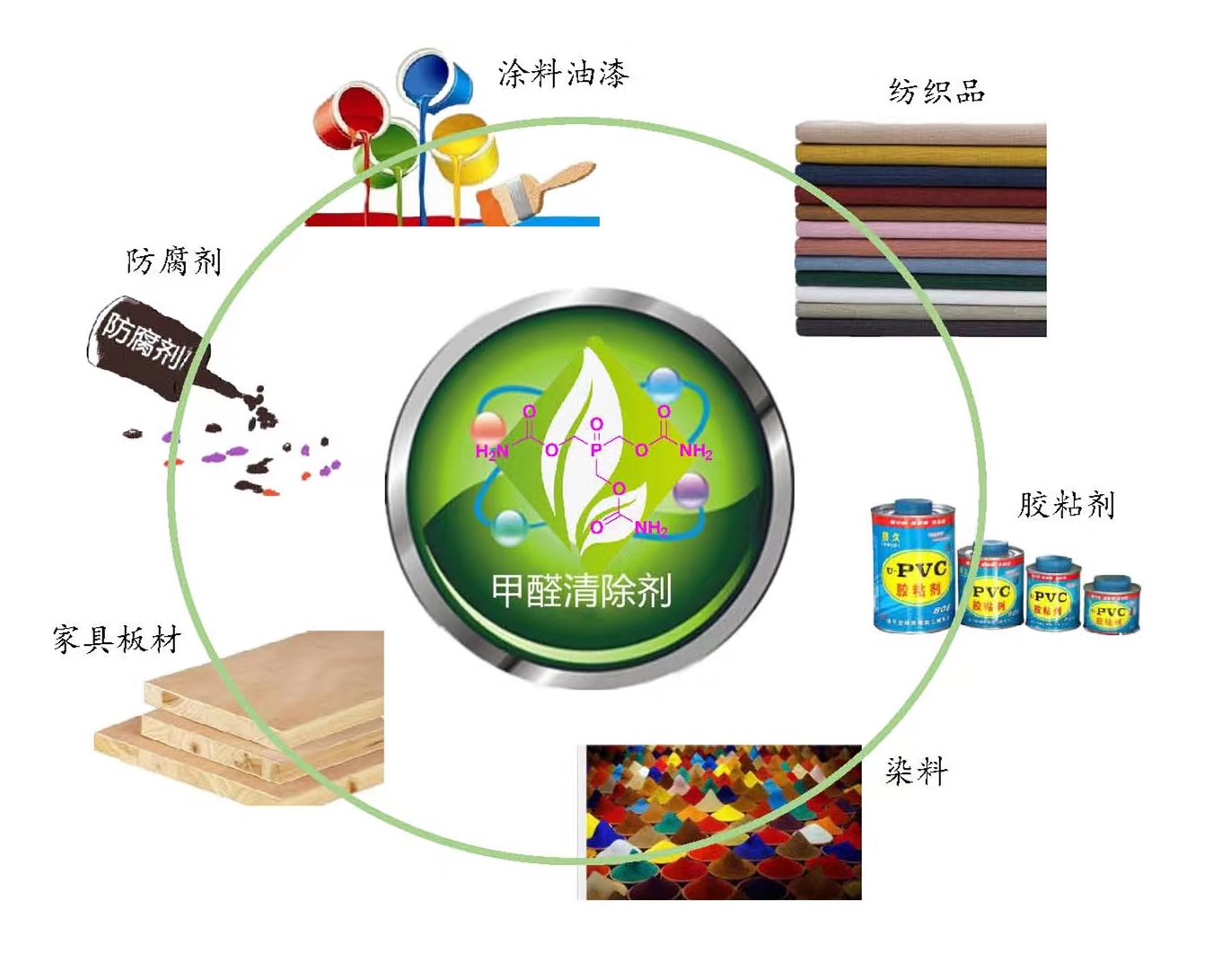 尚学芳教授团队研发的氨基甲酸酯三羟甲基氧化膦类新物质,可用作甲醛清除剂且具有一定的阻燃性能。该物质性能稳定、水溶性好、合成工艺简单、安全环保、成本低,已达到中试化生产工艺,可通过喷洒、添加等方式应用于油漆、涂料、纺织品、板材、胶粘剂等产品中甲醛的清除。