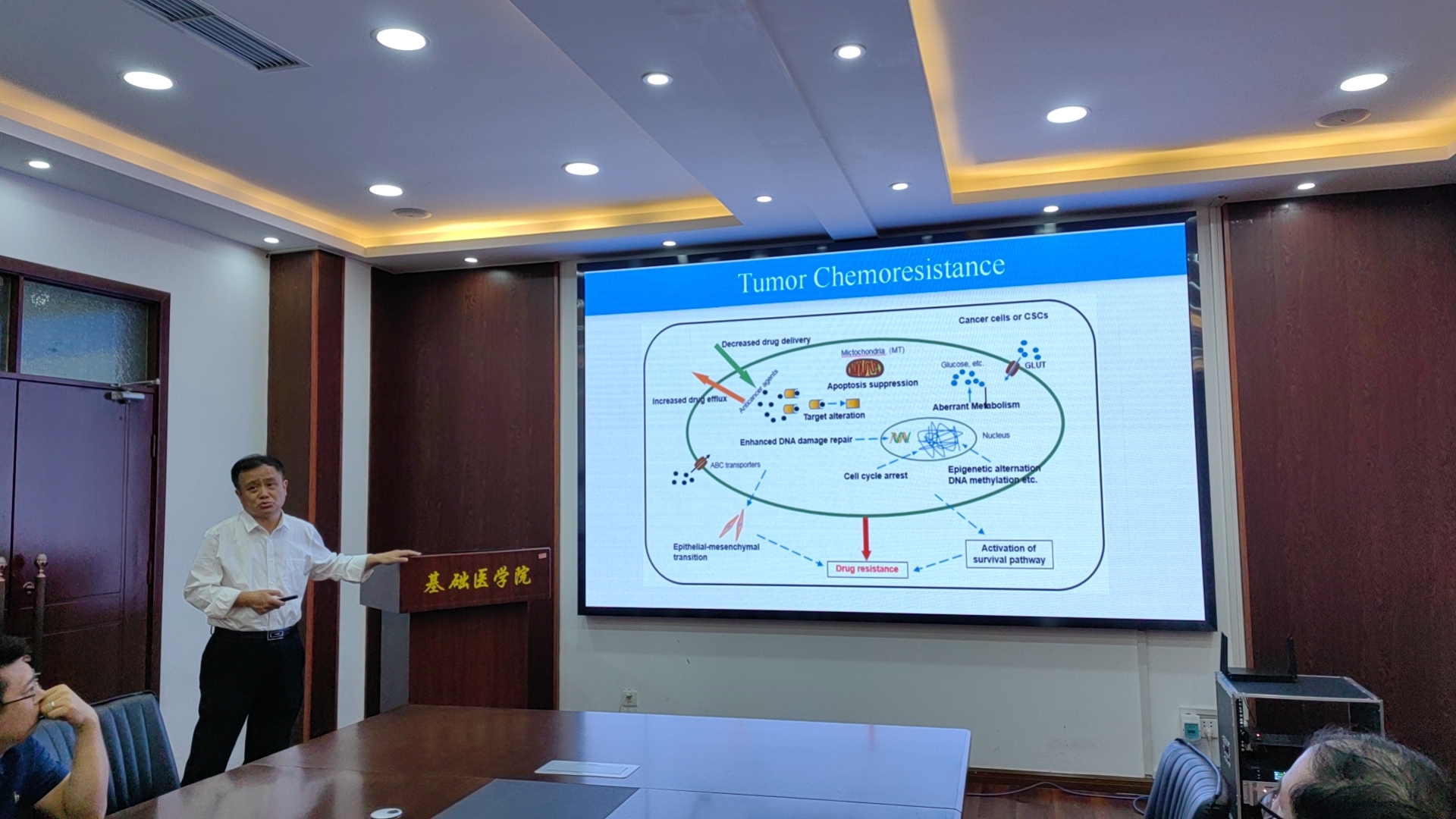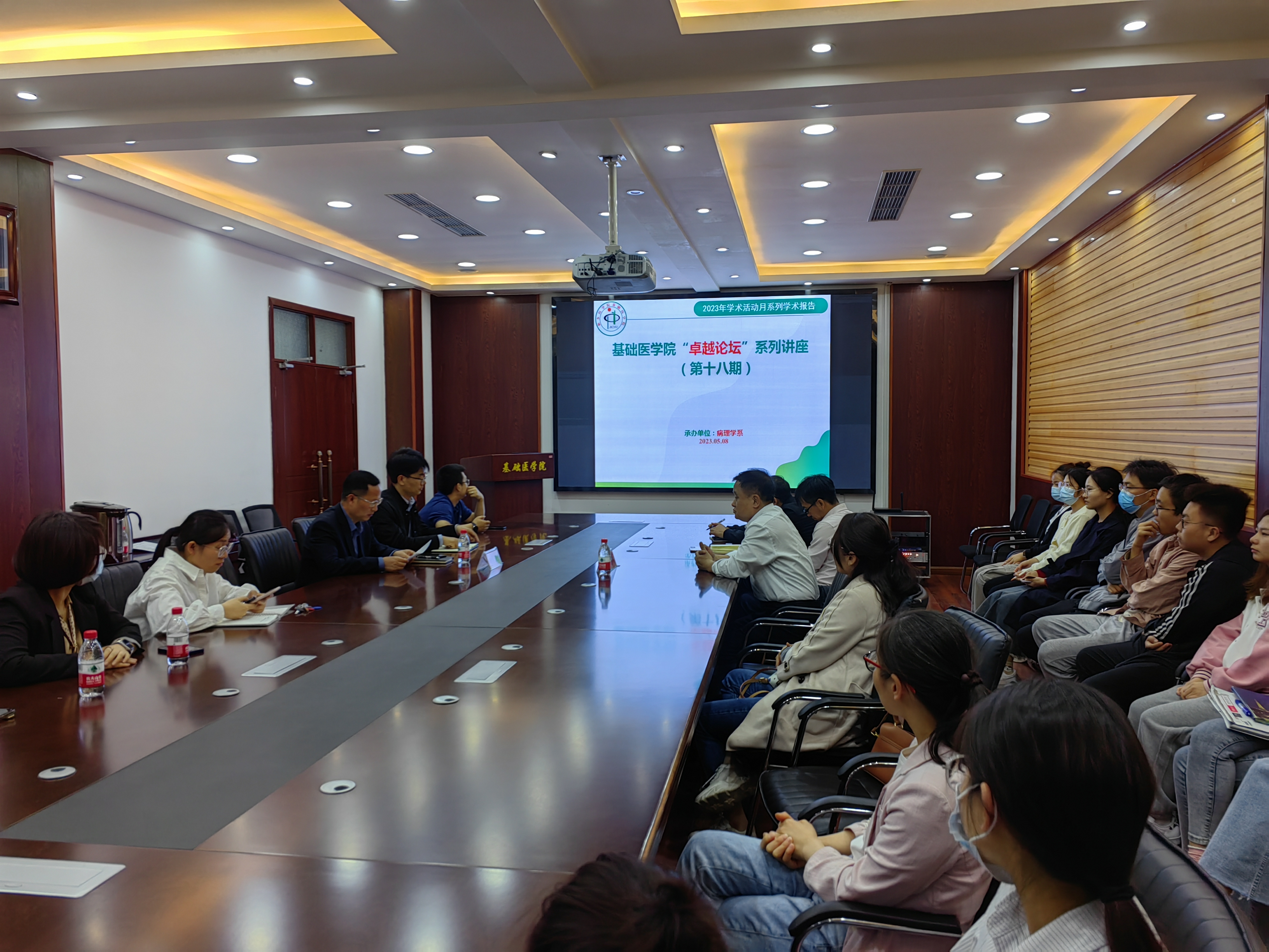 (文/图 王帅 单琳琳 赵铁锁)2023年5月8日下午,由病理学系承办的“卓越论坛”系列讲座第十八期在求是楼六楼基础医学院第一会议室顺利举行。吉林大学基础医学院孙连坤教授应邀做了题为“线粒体蛋白输入与卵巢癌细胞耐药”的学术报告。论坛由学院副院长千新来教授主持,学院有关学科带头人、博士、青年教师和研究生认真聆听了本次报告。