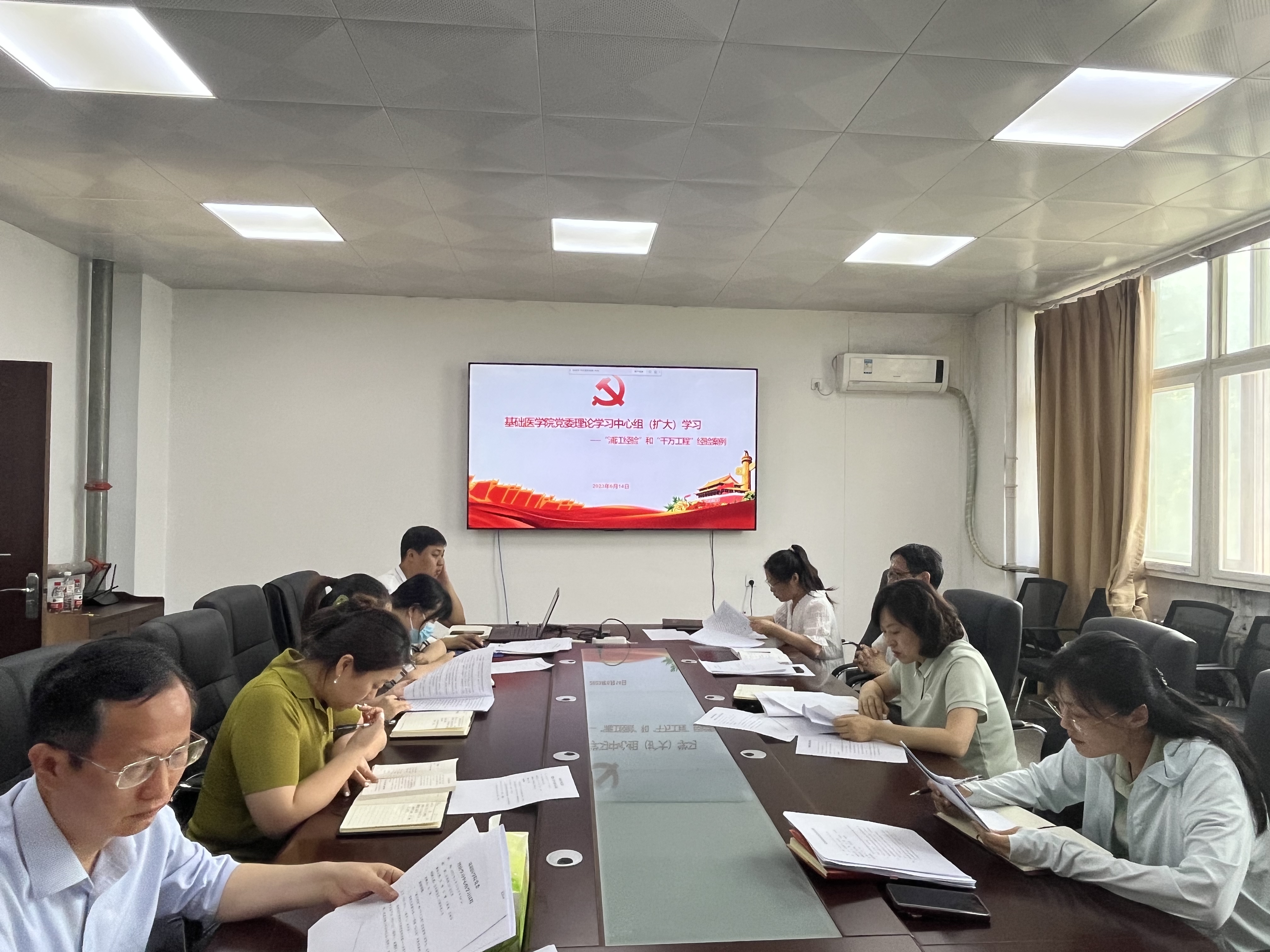 (文/刘慧 图/郑佳)2023年6月15日,基础医学院党委在求真楼三楼基础医学院第二会议室组织理论学习中心组(扩大)学习会——“浦江经验”和“千万工程”经验案例学习交流活动。学院党政领导班子成员,各行政科室负责人、全体辅导员等参加此次经验学习。