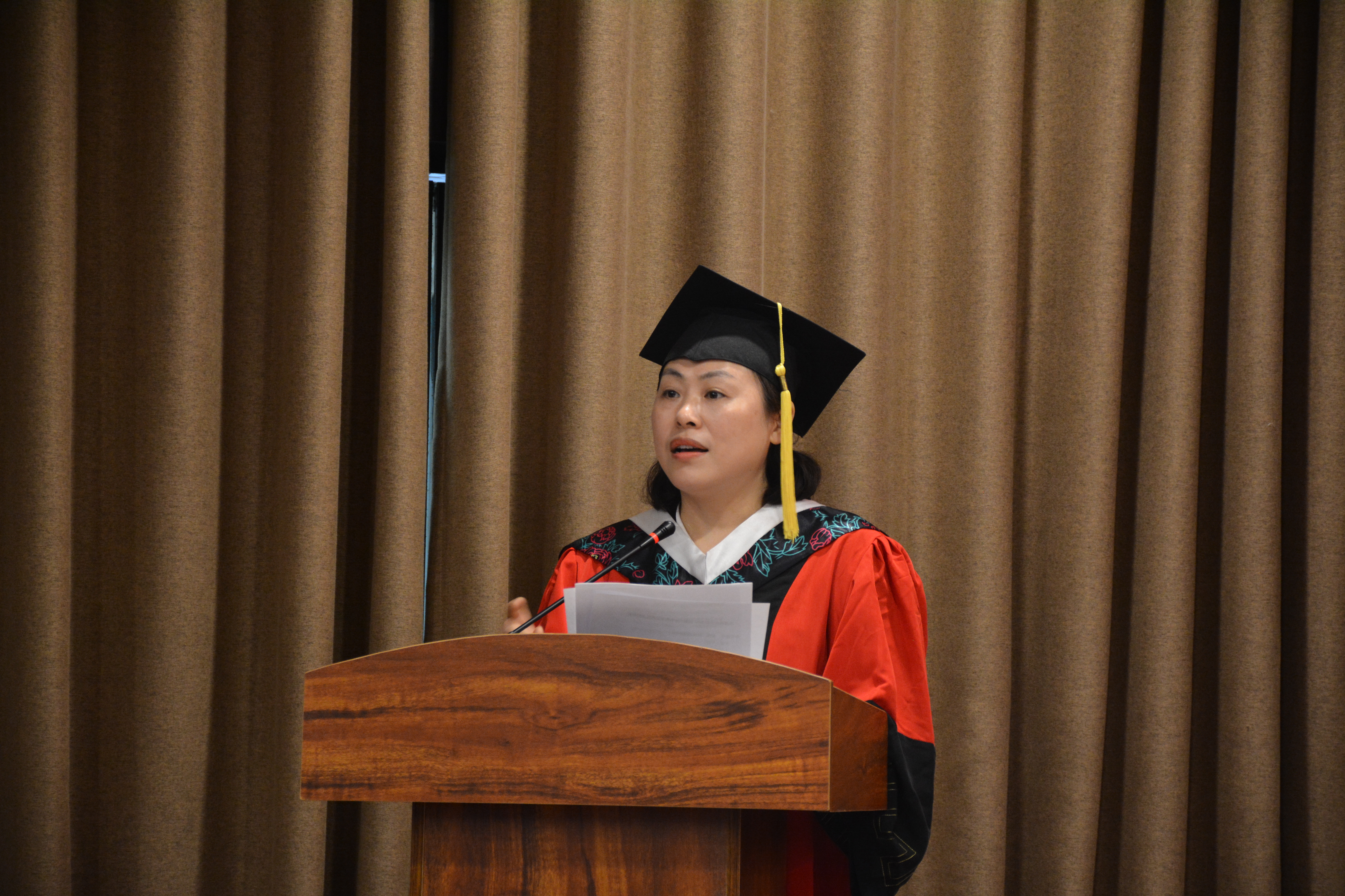 任峰在致辞中首先代表学院向圆满完成学业的35名毕业生表示衷心祝贺,回顾了毕业生三年来取得的成绩,并寄语他们:一是要脚踏实地。九层之台起于垒土,希望他们不浮躁、不虚夸,耐得住寂寞,持之以恒,扎扎实实做好每一项工作;二是要宽厚包容。“一花独放不是春,百花齐放春满园。”希望他们用宽厚与包容更好的适应社会和生活;三是要砥砺心智。希望他们离开学校在顺境中居安思危、在逆境中坚忍不拔、在纷繁复杂的环境中,胜不骄、败不馁,勇敢而顽强地迎接挑战、成为最积极、最活跃、最有生气核心力量。