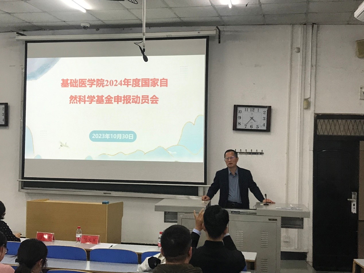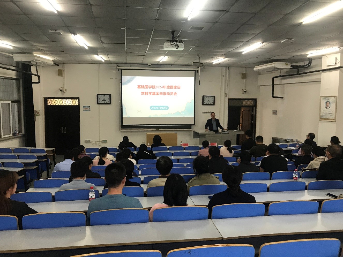 (文/王帅 图/赵兴华)2023年10月30日下午,我院2024年度国家自然科学基金申报动员会在第二教学楼2202教室召开。科技发展部副主任倪天军、基础医学院党委书记任峰、副书记白婕、基础医学院副院长千新来出席。学院各学系、实验室负责人和业务教师参加,会议由学院科研办负责人主持。