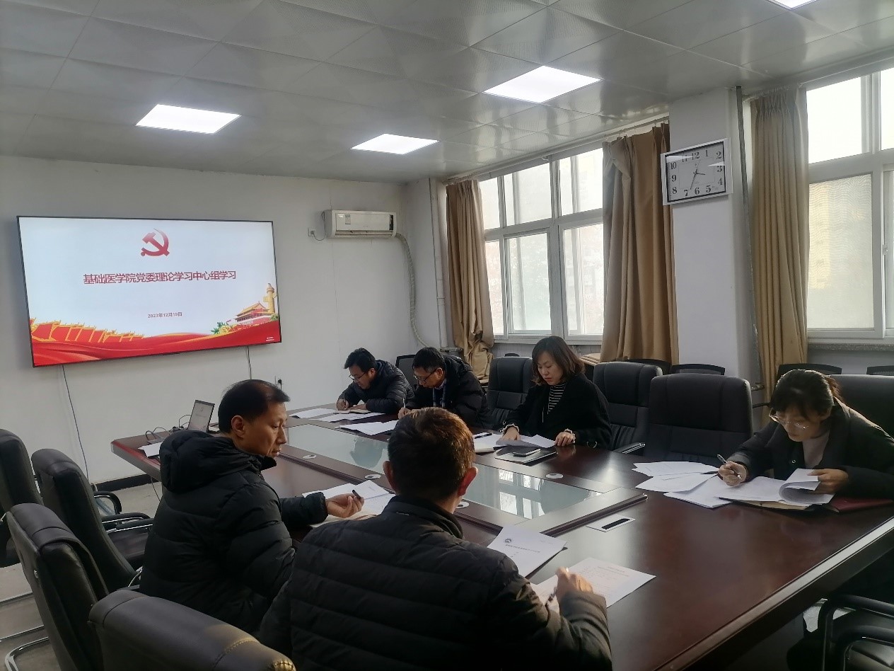 (文/图 吴文斌)12月19日下午,学院党委在求真楼东配楼三楼331会议室召开理论学习中心组集体学习会议。基础医学院党委书记任峰、副书记白婕,基础医学院副院长熊熙文、学术副院长江林华、副处级组织员李照勇、副处级教学督导员千智斌参加了会议。会议由任峰主持。