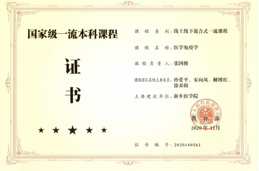 我院免疫学课程自2016年建设完成在线开放课程以来,不断建设和创新,在国家高等教育智慧教学平台、中国大学MOOC、智慧树、学银在线等平台开放共享,先后获得医学免疫学、免疫与临床等3门河南省一流本科课程,并于2020年获批首批国家级线上线下混合式一流本科课程。课程教学团队被认定为河南省课程思政教学团队、河南省虚拟教研室。