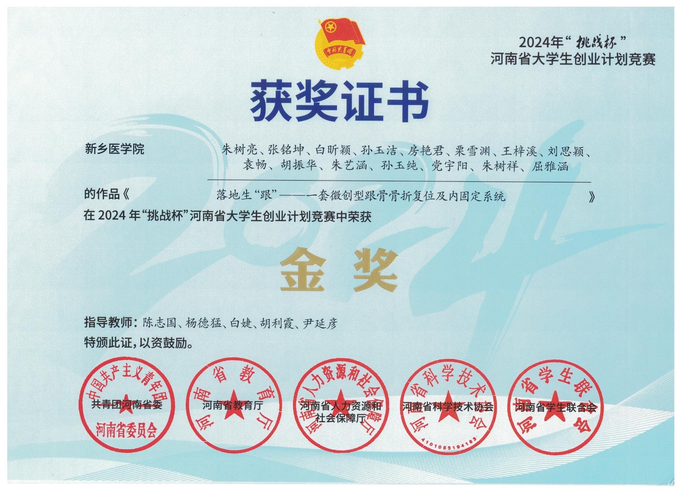 在“挑战杯”河南省大学生创业计划大赛的舞台上,学院创业团队表现出色。人体解剖学与组织胚胎学系教师参与的作品《落地生“跟”--一套微创型跟骨骨折复位及内固定系统》斩获大赛金奖。团队成员来自不同专业,他们将各自的专业知识与创新理念相融合,从市场调研、产品设计到商业模式构建,精心打磨每一个环节,充分体现了跨学科协作与创新精神。