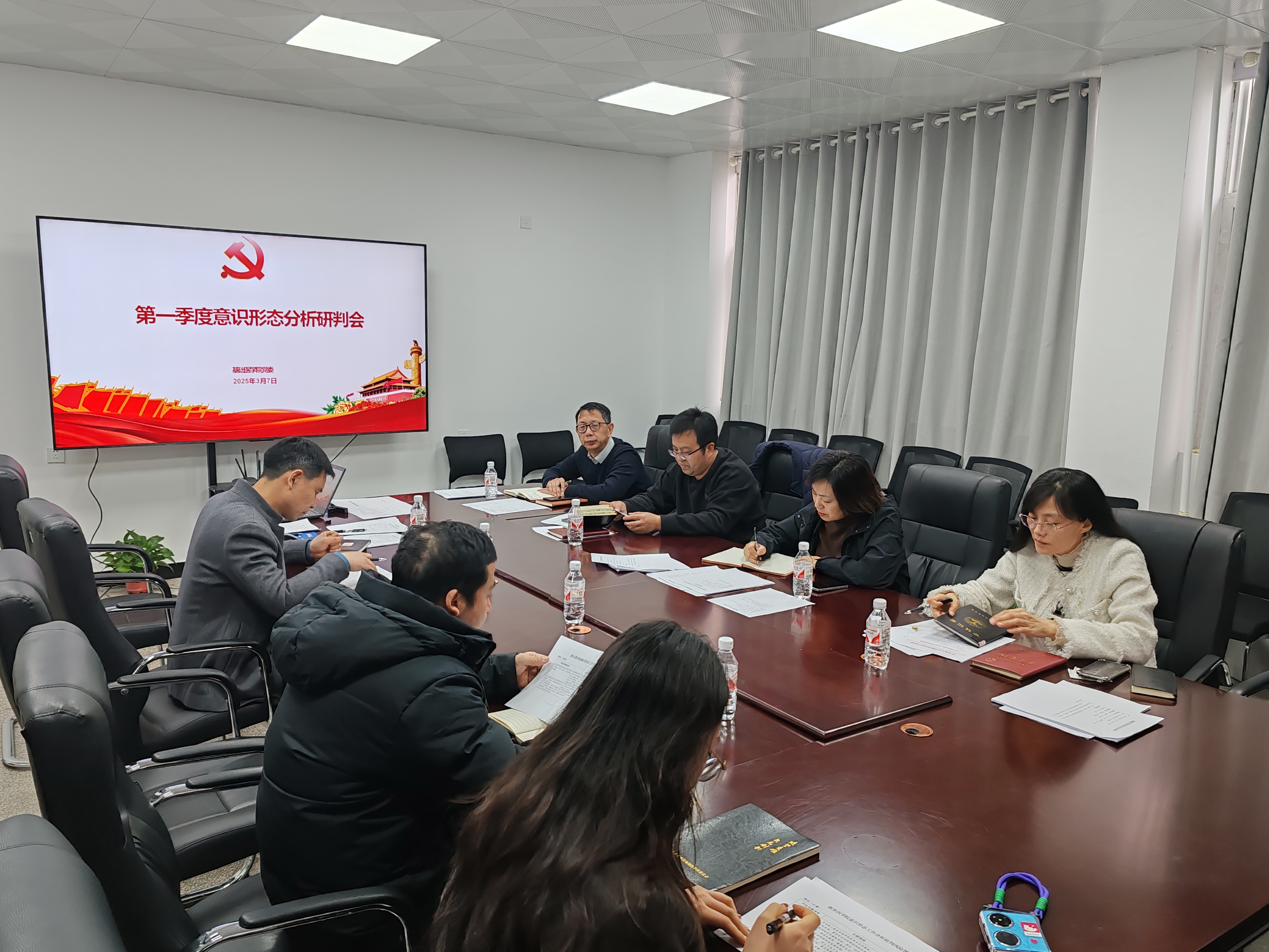(文/图 吴文斌)3月7日上午,基础医学院党委在求真楼331会议室召开2025年第一季度意识形态工作分析研判会。党政领导班子全体人员、党政办公室、学生工作办公室、团委、研究生培养与学位点建设等科室负责人参加会议。会议由党委书记任峰主持。