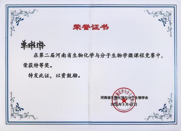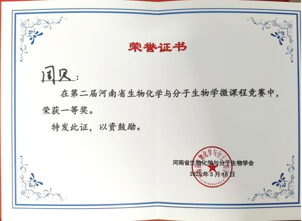(文/图:宋娜,单琳琳,周贝)近日,在2025年河南省生物化学与分子生物学学会微课程竞赛中,我院生物化学与分子生物学系单琳琳和周贝老师在紧张激烈的竞赛角逐中脱颖而出,分别荣获特等奖和一等奖。