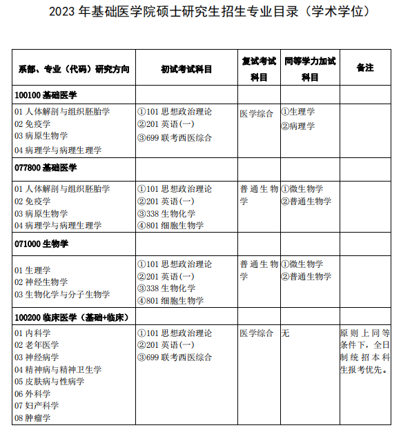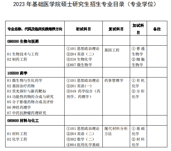 招生专业方向涵盖:100100基础医学、077800基础医学、071000生物学及100200临床医学(基础+临床)学术学位;086000生物与医药、105500药学及085600材料与化工专业学位,欢迎报考基础医学院(/jcyxy/)。