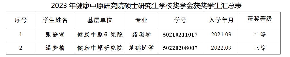 2023年健康中原研究院硕士研究生学校奖学金获奖学生名单公示