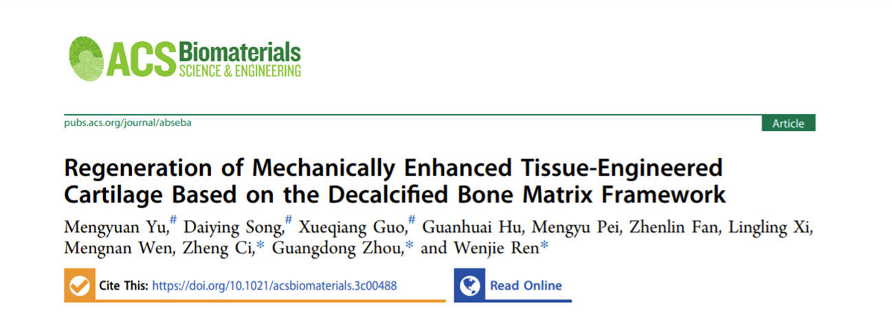 近日,我院任文杰教授团队在国际知名期刊《ACS Biomaterials Science & Engineering》上发表了题为“Regeneration of mechanically enhanced tissue-engineered cartilage based on decalcified bone matrix framework”的研究成果。该成果以健康中原研究院为第一作者单位,健康中原研究院导师团队指导的2020级硕士研究生于梦圆为第一作者,任文杰教授为通讯作者。