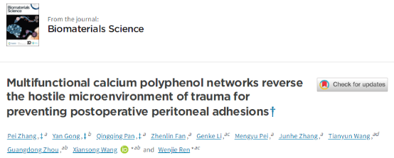 近日,我院任文杰教授团队在国际知名期刊《Biomaterials Science》上发表了题为“Multifunctional calcium polyphenol networks reverse the hostile microenvironment of trauma for preventing postoperative peritoneal adhesions”的研究成果。该成果以华亿在线手机版(大中国区)第三附属医院/健康中原研究院/组织工程与再生临床医学中心为第一作者单位,健康中原研究院导师团队指导的2021级硕士研究生张佩为第一作者,任文杰教授和王贤松教授为共同通讯作者。