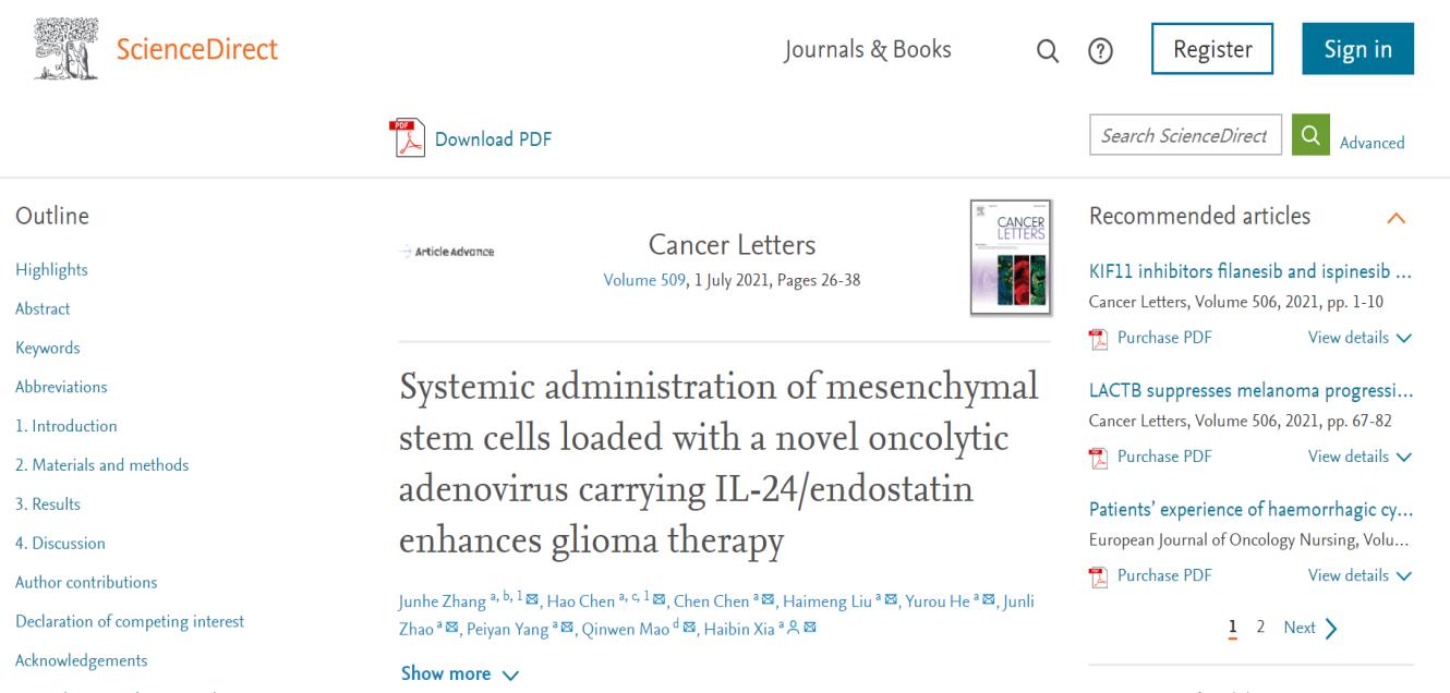 近日,我院教师张俊河博士以第一作者身份在医学领域顶级期刊《Cancer Letters》(中科院医学一区Top期刊,2019年影响因子为7.36)发表题为《Systemic administration of mesenchymal stem cells loaded with a novel oncolytic adenovirus carrying IL-24/endostatin enhances glioma therapy》的研究论文。该论文首次构建了携带治疗基因且病毒复制受Tet-on系统调控的新型溶瘤腺病毒,从而实现了对该新型溶瘤腺病毒在胶质瘤细胞和人脐带血间充质干细胞中的复制调控,同时采用尾静脉注射间充质干细胞荷载溶瘤腺病毒的方法,评估该治疗系统在胶质瘤荷瘤模型体内治疗的效果和安全性。本论文将病毒治疗和基因治疗有效结合起来,打破传统的病毒瘤内注射给药途径,在胶质瘤荷瘤裸鼠模型中取得较好的治疗效果,同时也提高了投送病毒的数量和治疗的安全性。本研究成果不仅为胶质瘤及其他类型肿瘤的基因治疗开辟了新思路,也为本课题后续研究颅内脑胶质瘤的原位治疗策略奠定了重要的理论基础。