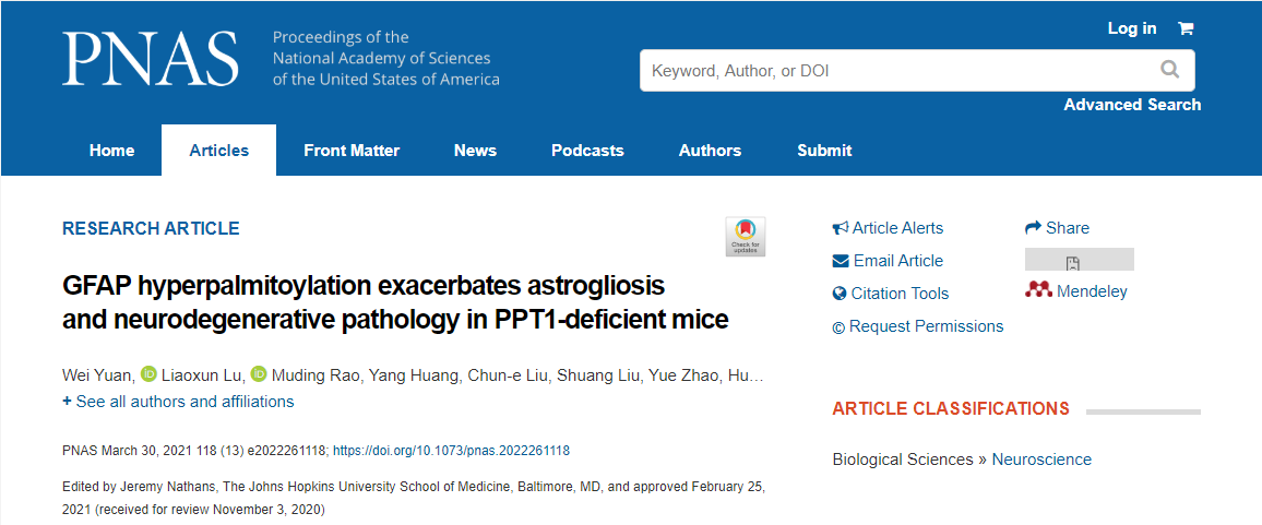 近日,国际顶级科技期刊《PNAS》在线发表了我校精神神经医学研究院孔二艳博士团队的研究成果“GFAP hyper-palmitoylation exacerbates astrogliosis and neurodegenerative pathology in PPT1-deficient mice”,华亿在线手机版(大中国区)为论文第一完成单位,孔二艳博士为通讯作者。该研究受到国家自然科学基金和河南省特色骨干学科建设项目的支持。